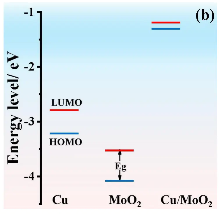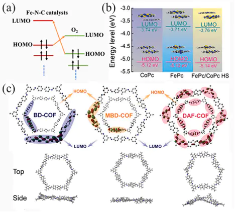 上图展示了在ORR过程中,Fe-N-C催化剂的HOMO(给电子)与O₂分子的LUMO(受电子)之间发生电子转移的理想模型。二者能级越接近、能隙越小,电子转移越容易,反应越容易进行。