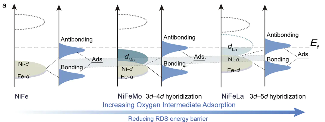 上图为理解d带中心理论的核心概念图。它表明,当Fe的3d能带中心向下移动(远离费米能级) 时,反键轨道的填充减少,Fe-O键减弱,这有利于OOH或OH中间体的脱附,从而加速反应动力学。