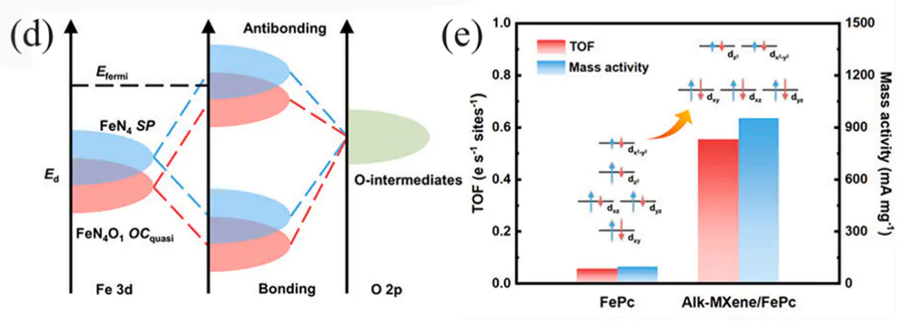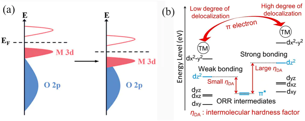 例如,Fe的dₓ²轨道与O的p₂轨道杂化形成σ键,而dₓᵧ、dᵧ₂轨道与pₓ、pᵧ轨道形成π键。这种杂化强度直接决定了Fe–O键的强弱,进而影响ORR反应速率。