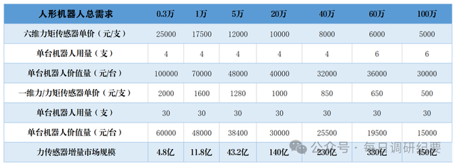 当机器人需求量到100万台时对应力传感器的市场增量空间超过450亿(目前传感器处于产业化初期 单价较高,后续的降本空间为推算,可能降本会比预期幅度更大)
