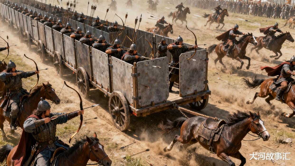 士兵们迅速将偏箱车连接起来,组成一道移动的营垒。车上有挡板,士兵可躲在后面放箭。遇到狭窄处,则将车分开,两车并排而行,依然严整如初。