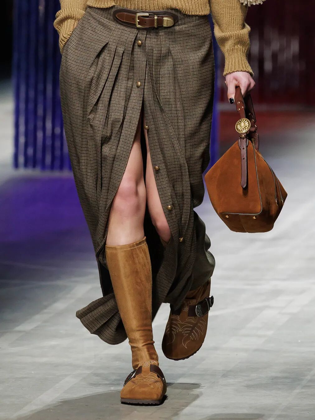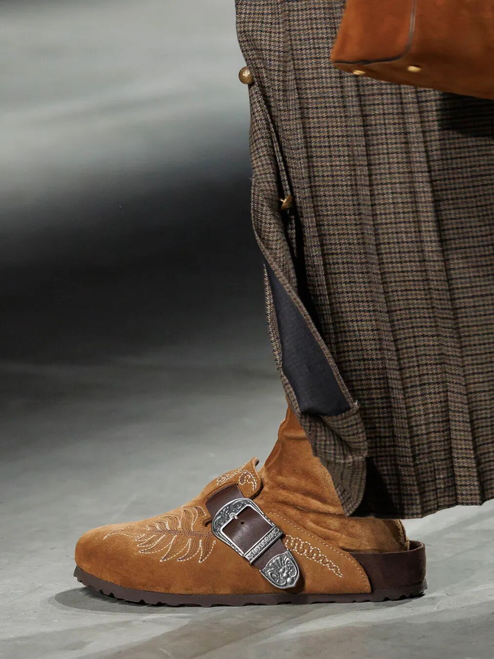 勃肯鞋现在常代表着慵懒、松弛,但其中优雅的质感也应该同样被放大。比如近来与意大利品牌 ETRO 的秀场级合作:2 月的 ETRO 2026 秋冬秀场上,模特们穿上了特别的 Boston 联名款。这次合作,鞋面是优质的绒面革,还有纳帕皮制成的固定带,并辅以西部风格的搭扣,再有鞋面的 ETRO 标志性古典纹样,每一处都是优雅的气息!勃肯鞋的全面气质在这次联名中都带出来了,非常看好!