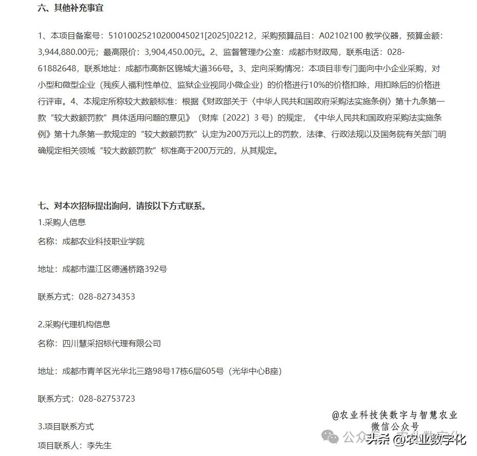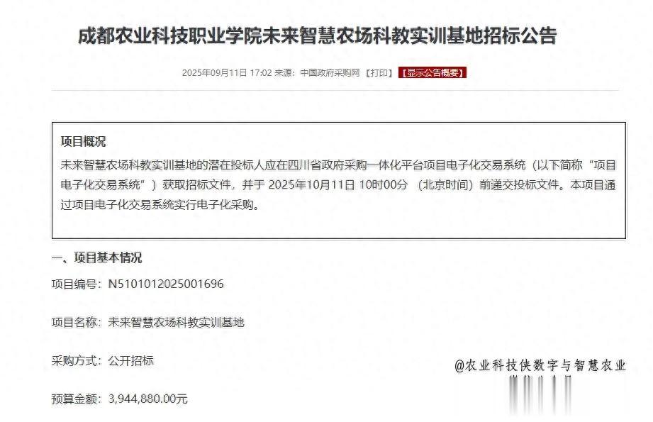 ↖ 喜欢请关注/置顶,农业新视角,谢谢近日,四川慧采招标代理有限公司发布:成都农业科技职业学院未来智慧农场科教实训基地招标公告,根据公告中提到的采购需求清单,包括电动智能拖拉机、收割机自动收割作业系统、无人驾驶数据采集平台、智慧农场AI大脑管理系统等,详细清单可在文末下载。