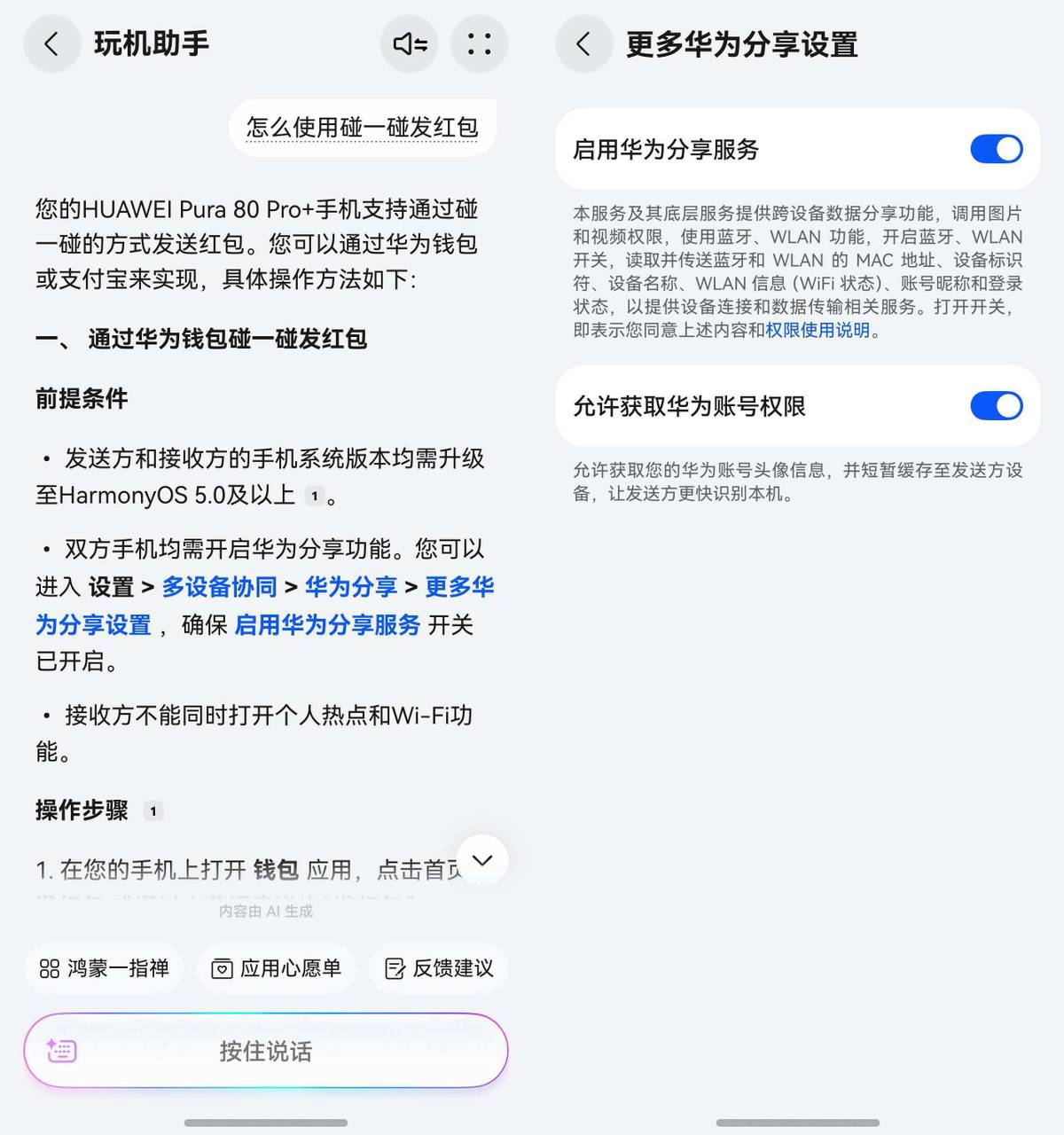 提问“怎么使用碰一碰发红包”,玩机助手很快就会给到你详细的步骤说明。更贴心的是,回复里还有蓝色加粗的关键词,点一下,直接跳转到对应的设置页面,不用我们自己再一层层去设置菜单里翻找。
