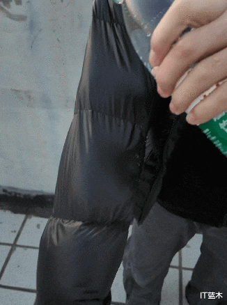 将整杯水泼向羽绒服前胸,水珠依旧保持球状滚落,擦拭后无任何湿痕残留。虽然它并非专业冲锋衣,但日常户外遇到雨雪天气,完全能应对短时防护,无需额外穿雨衣。这源于其搭载的 PBE 三级抗湿黑科技,面料表面无需额外喷涂防水剂,却能实现高效防泼水、防溅水效果。