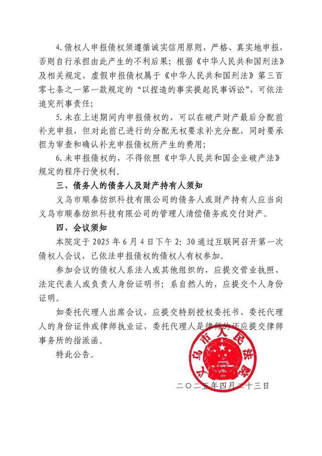 义乌市顺泰纺织科技有限公司破产清算案公告 义乌市人民法院 2025年04月27日