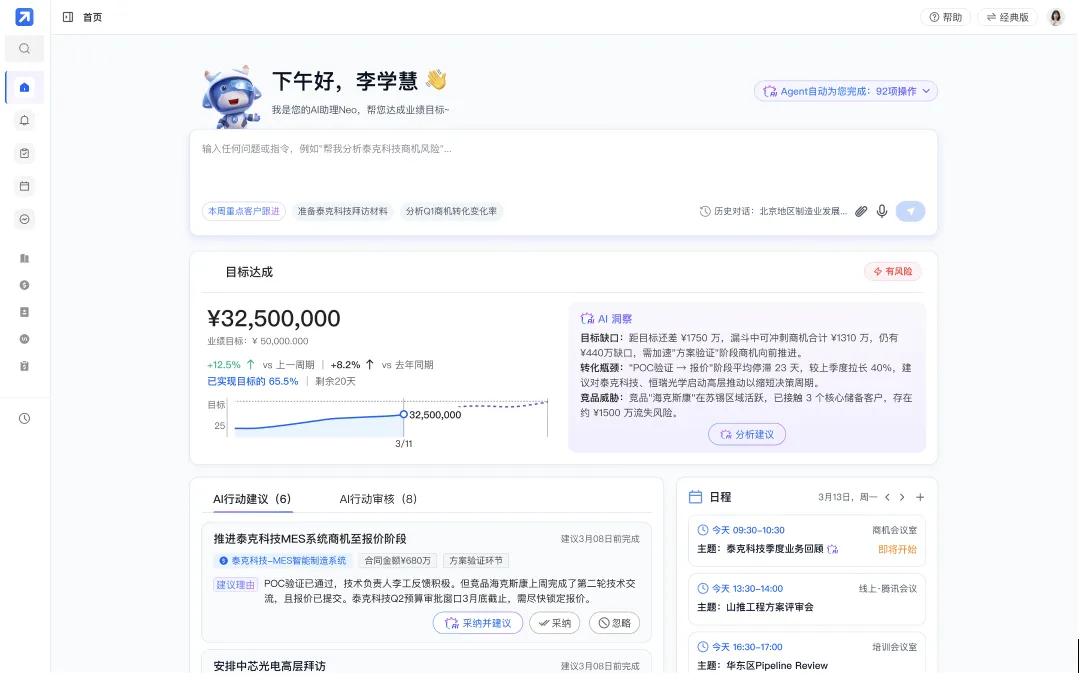 以销售易已经上线的NeoAgent 2.0首页为例,不同员工进入系统后,看到的是各自量身定制的界面:最醒目的位置是当前业绩目标与实际进展的差距、Agent给出的下一步行动建议、任务日程,以及一部分已经由Agent执行完成、等待员工确认审批的流程。底层虽然仍然连接着复杂的业务系统,但前台呈现给用户的,已经更接近一个“目标驾驶舱”。