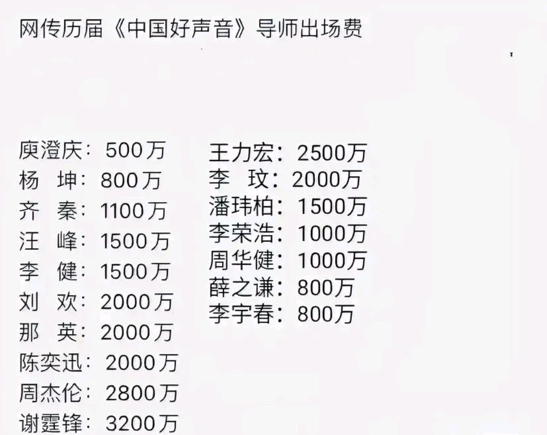 那么,历届《好声音》导师出场费到底是多少呢?我们一起来看看。