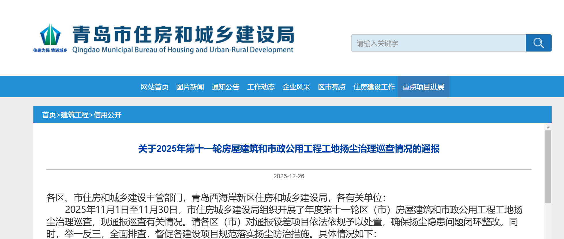 12月26日,青岛市住房和城乡建设局发布关于2025年第十一轮房屋建筑和市政公用工程工地扬尘治理巡查情况的通报。
