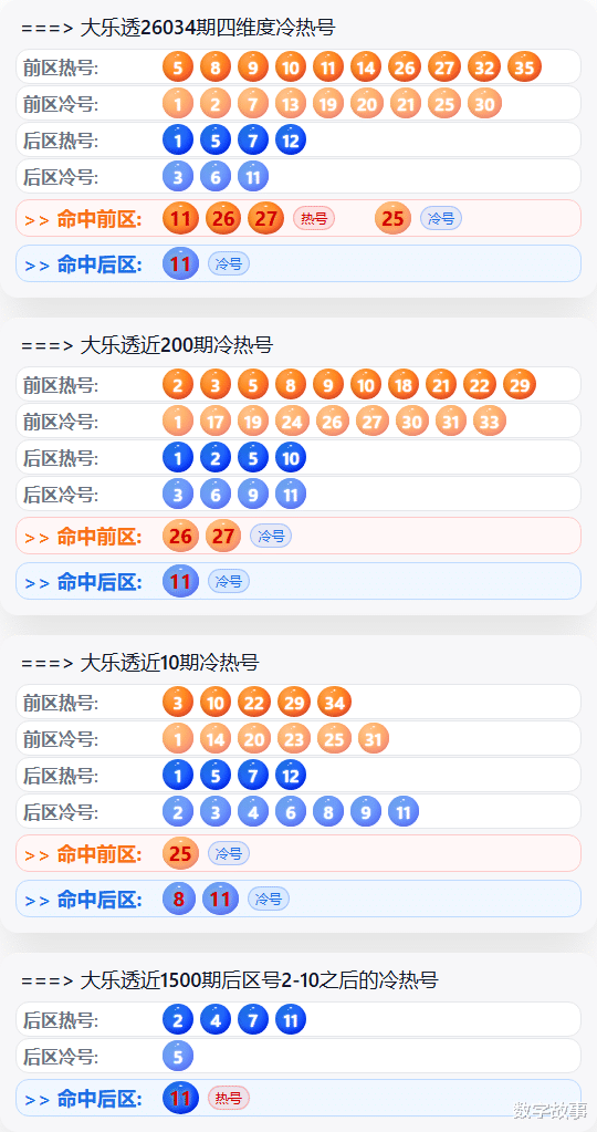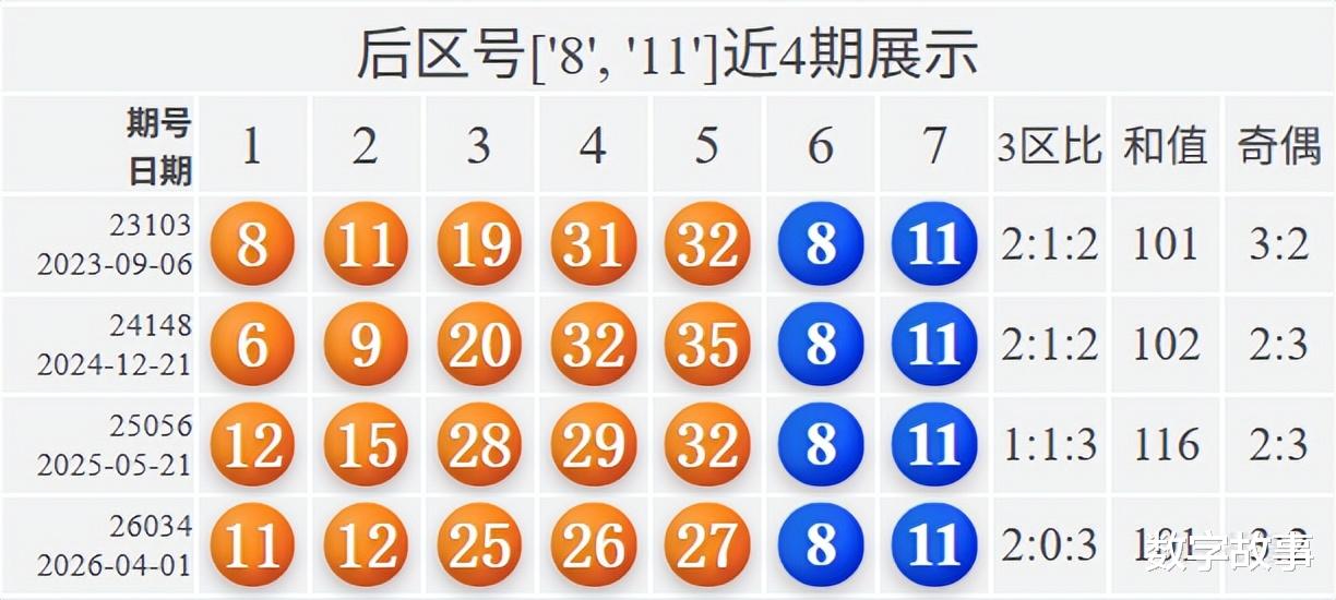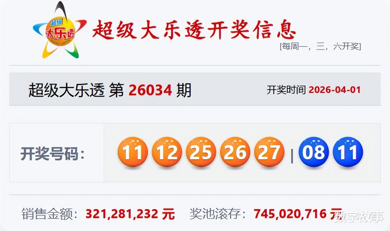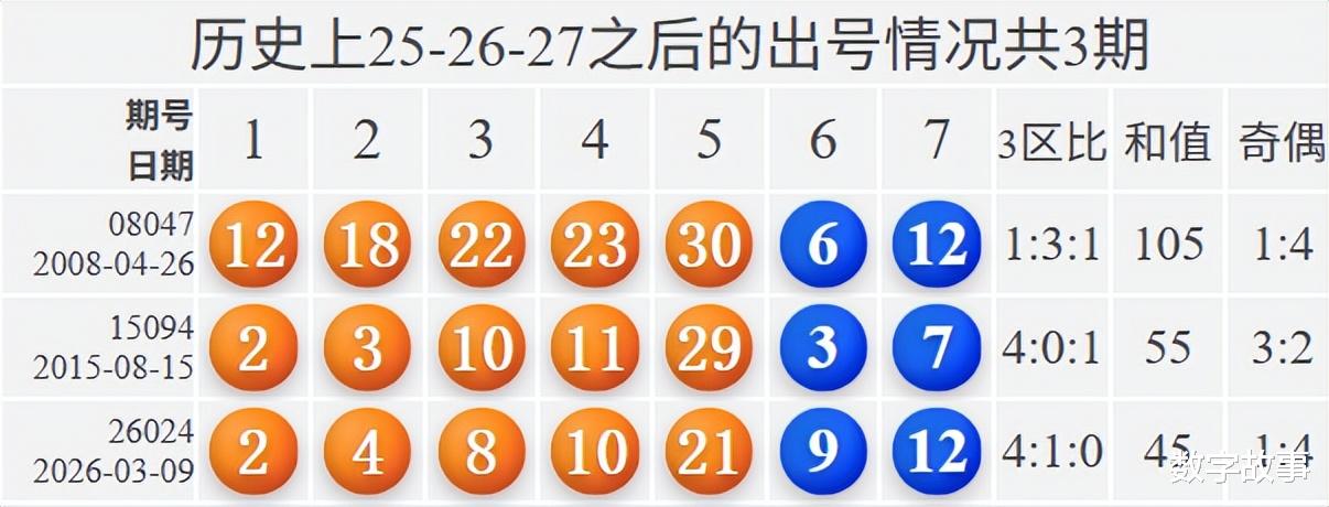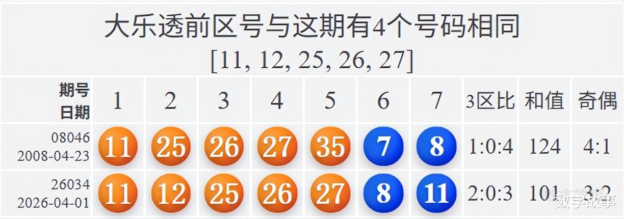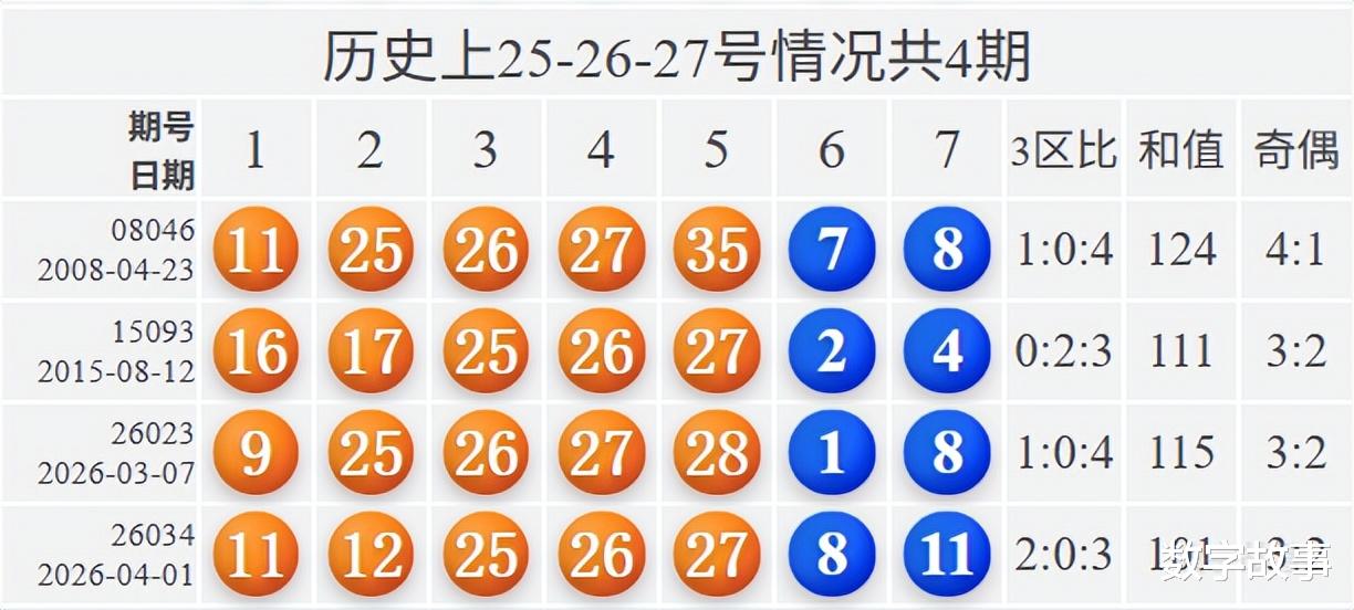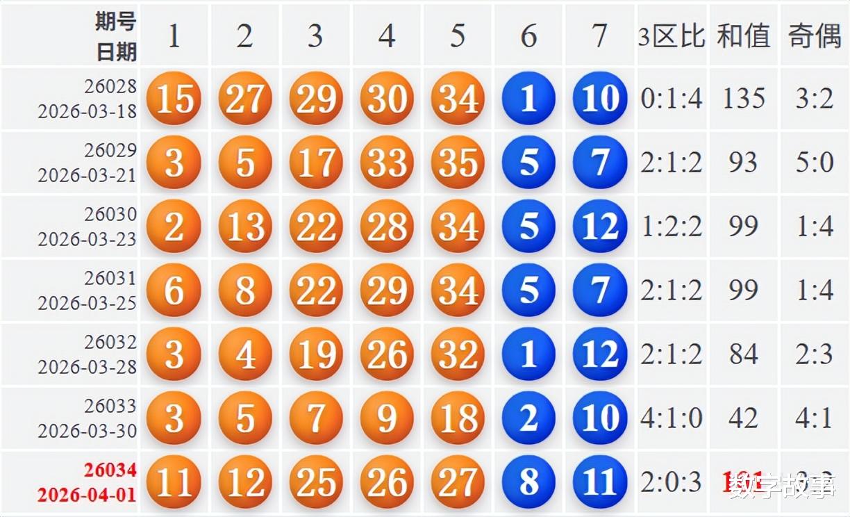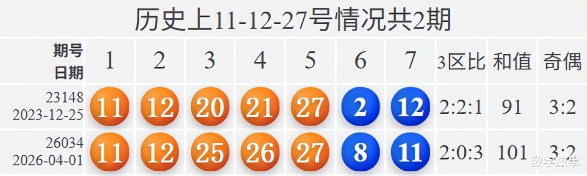 文末有大乐透前区三连号25-26-27, 及11-12-27的历史统计。【体彩大乐透26034期开奖结果及统计】前区号组合历史上有1期四球相同,后区8-11中断127期遗漏;6注一等奖,奖池7.450亿。大乐透26034期开奖结果及中奖情况:出奖时间: 2026-04-01 星期三 前区号:11-12-25-26-27后区号:8-11大乐透前区隔期下落:26前区奇偶比:3:2 前区和值:101前区跨度:16 三区比:2:0:3连号: 11-12, 25-26-27
