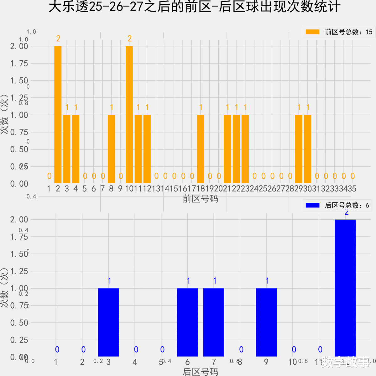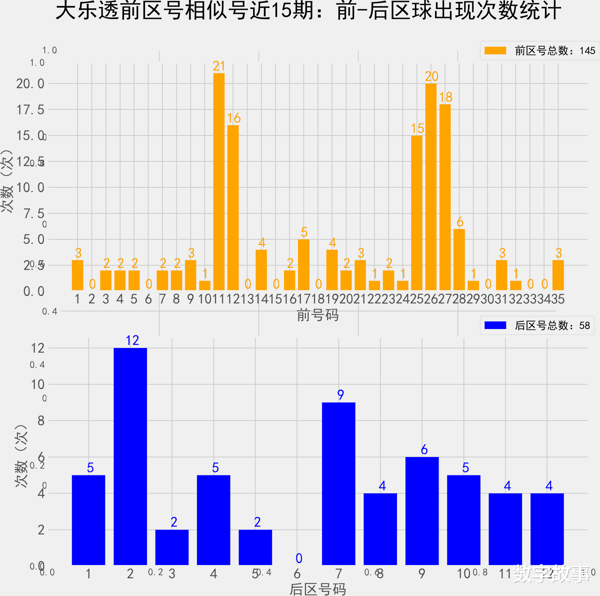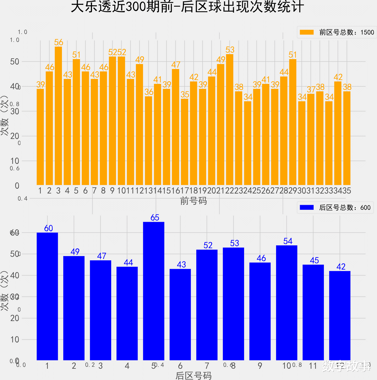 大乐透近300期前后区号统计情况统计样本数据: 1500个前区号码 600个后区号码