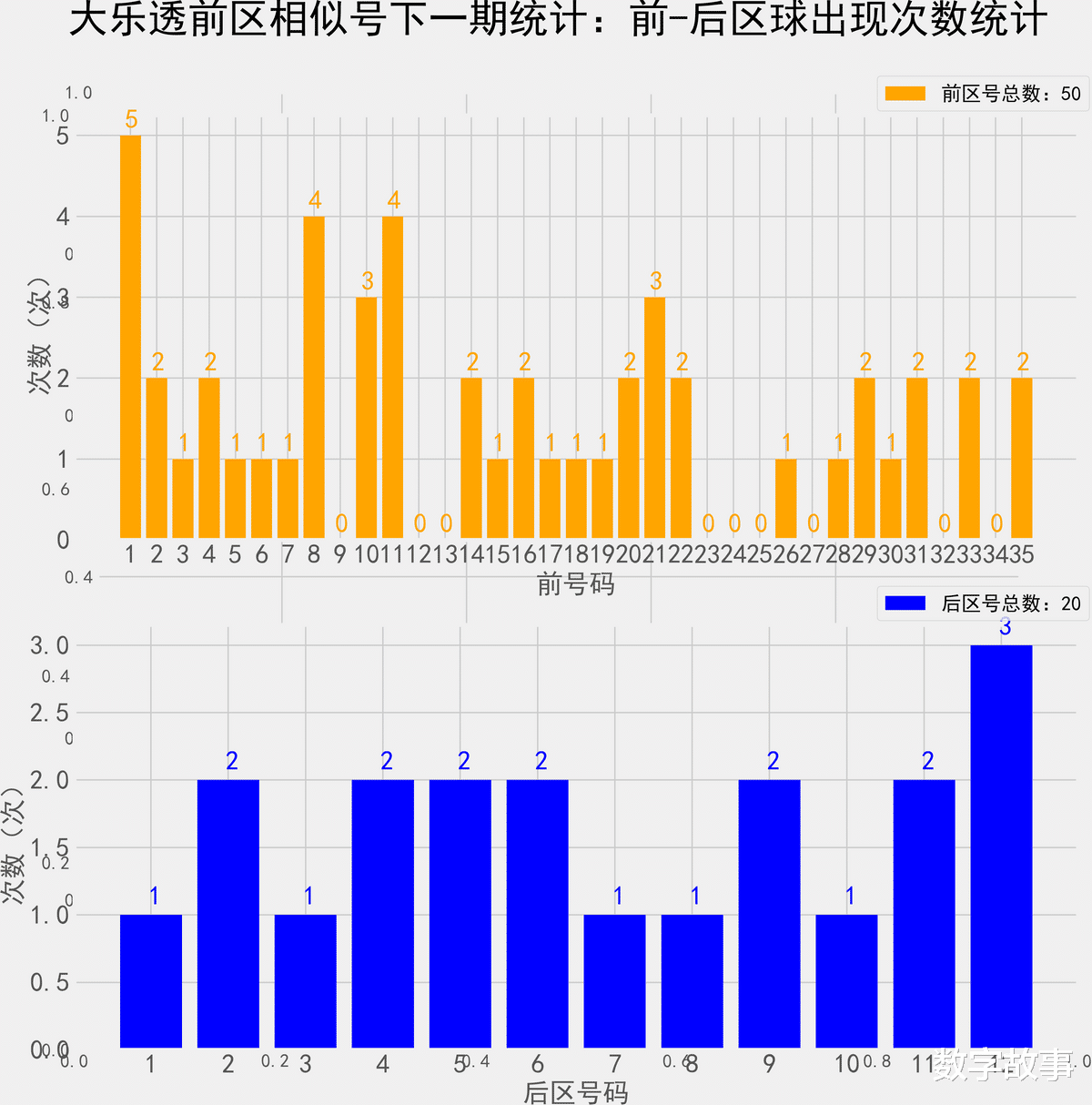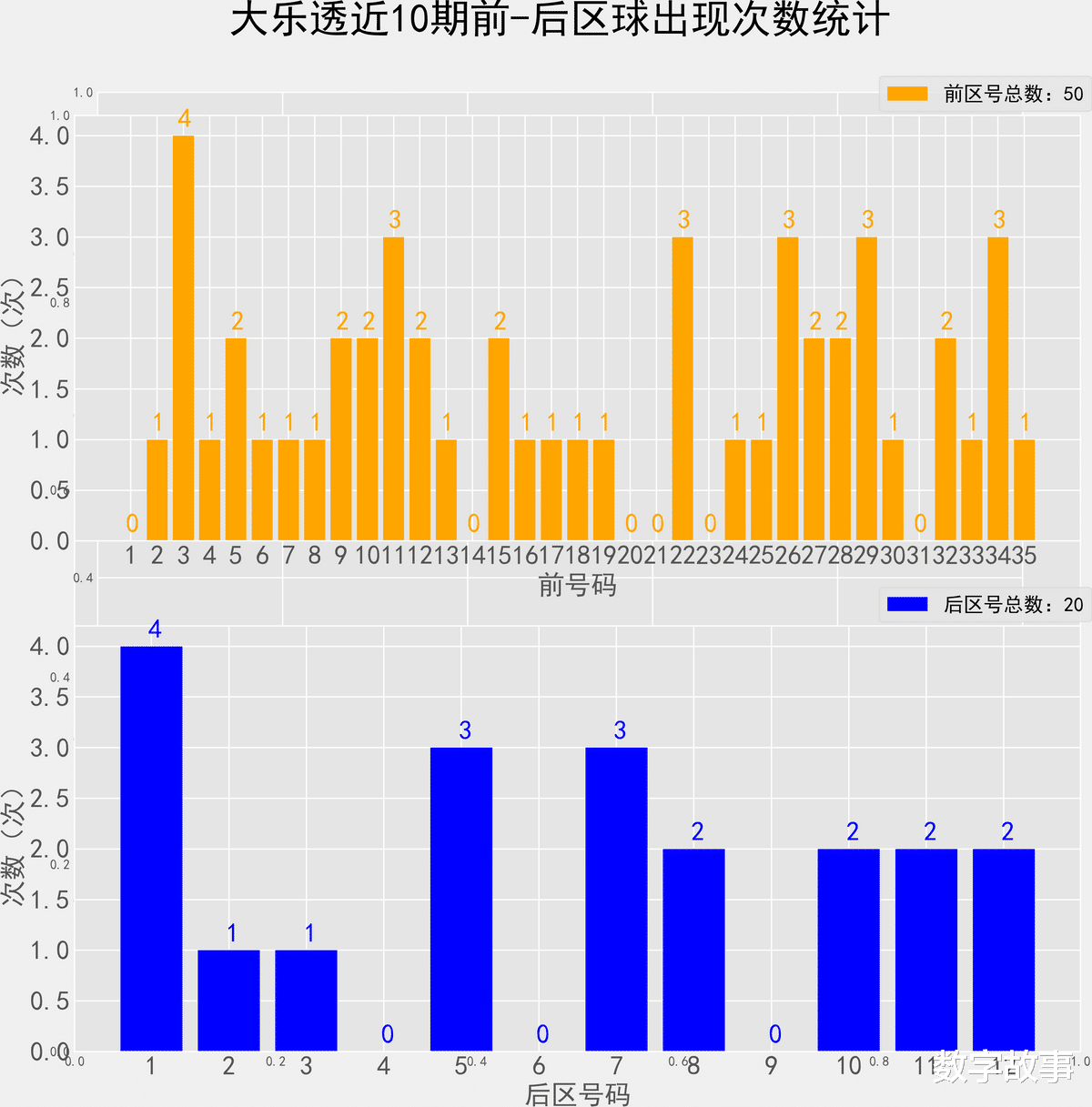 大乐透近10期前后区号统计情况统计样本数据: 50个前区号码 20个后区号码