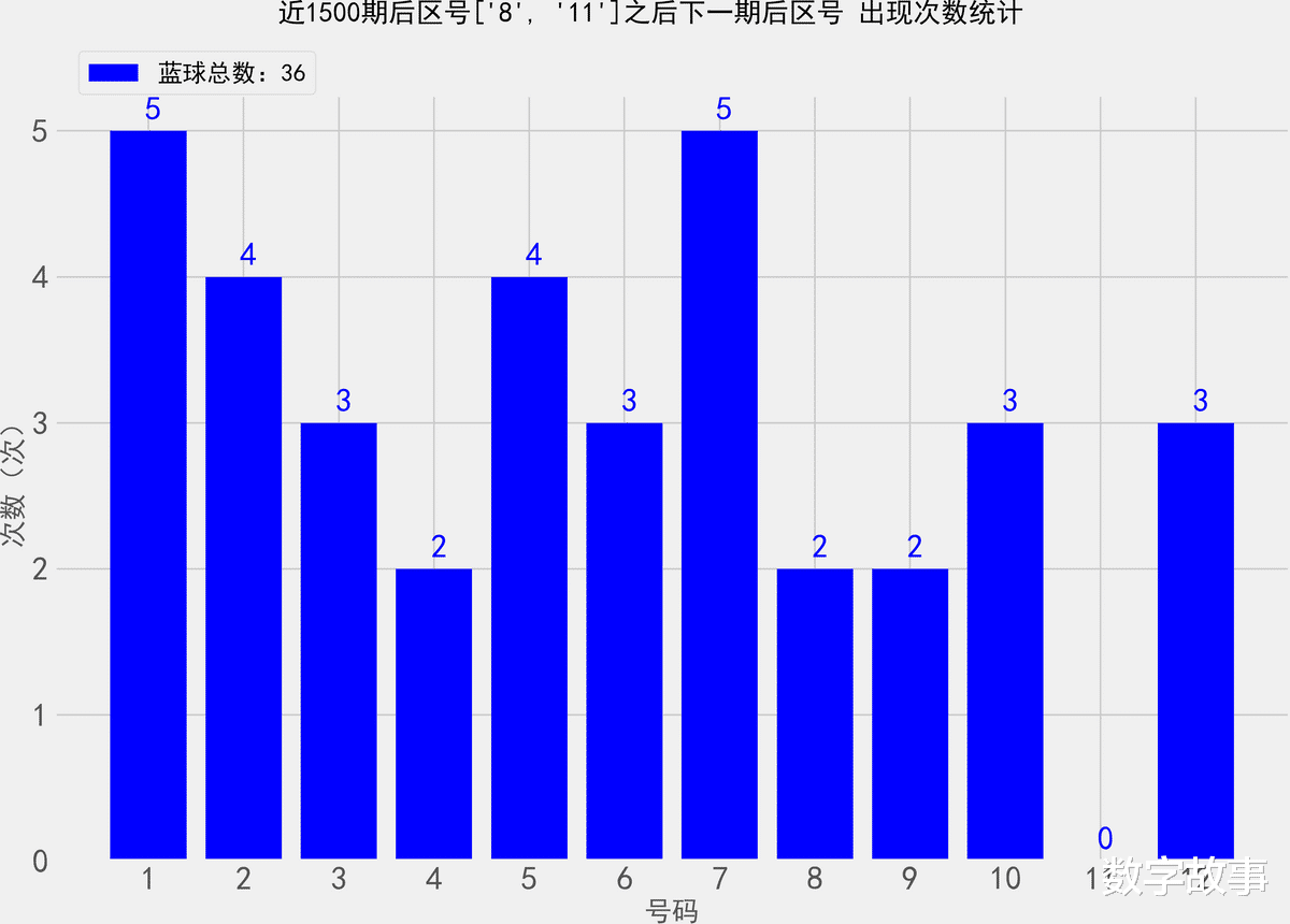 统计近1500期后区号8-11之后, 各后区号的出现次数大乐透26034期后区号是8-11找出近1500期后区8-11号之后,下一期出现的所有后区号,统计其出现次数。除开这一期,共出现了18次8-11后区号那么统计的样本数据是36个