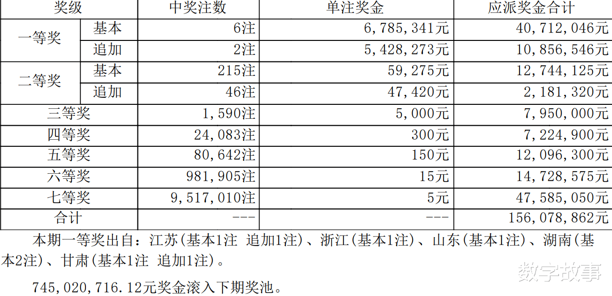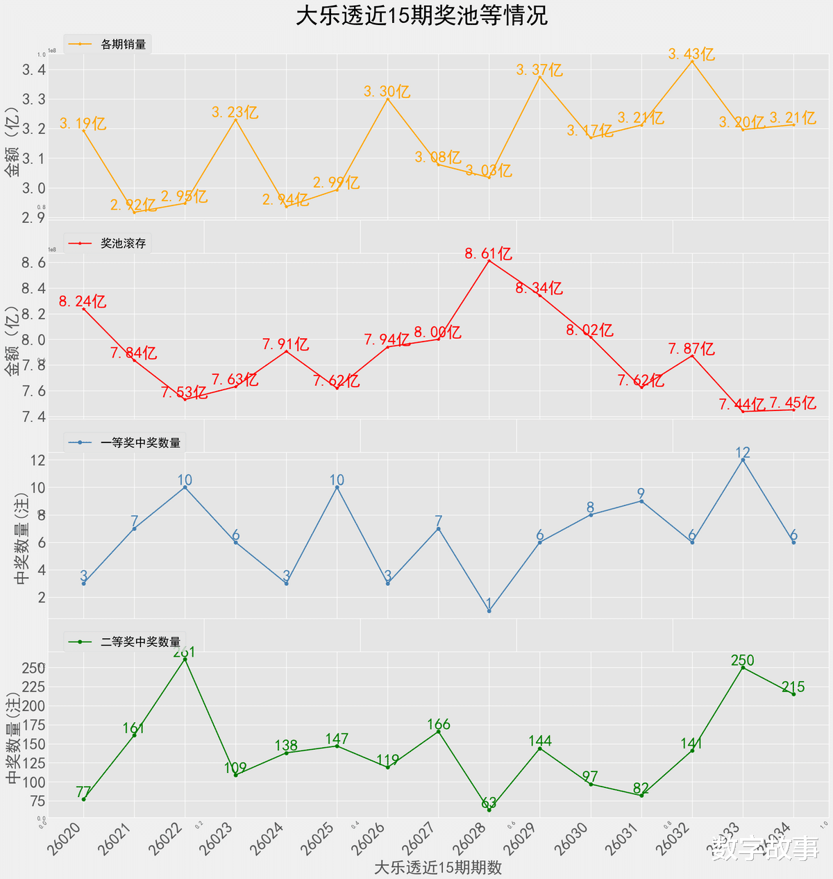 大乐透26034期一等奖:6注,追加: 2注二等奖:215注,追加: 46注。本期全国销售金额:3.213 亿 奖池滚存:7.450 亿.近15期奖池滚存, 中奖情况等信息: