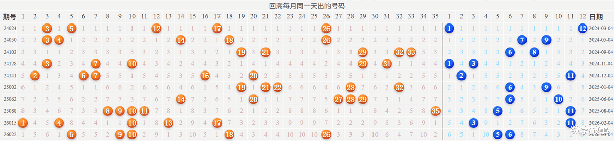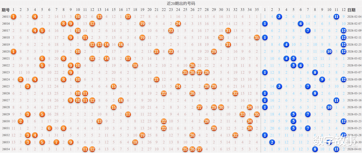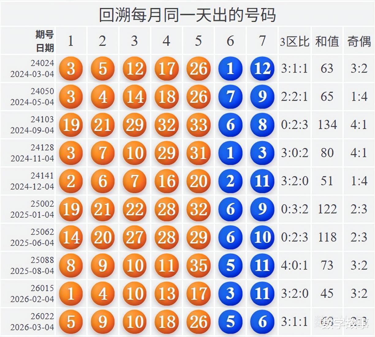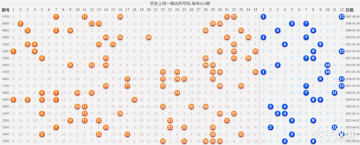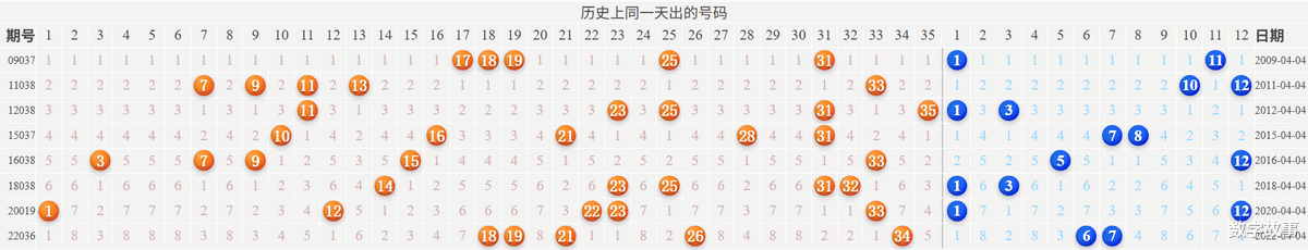 博弈心理,挑战概率: 看近期开奖号码,也可看历史数据统计!【大乐透26035期多角度冷热号】大乐透26035期四维走势图,前后区号统计及冷热号1) 历史同一天:04月04日 (共8期)
