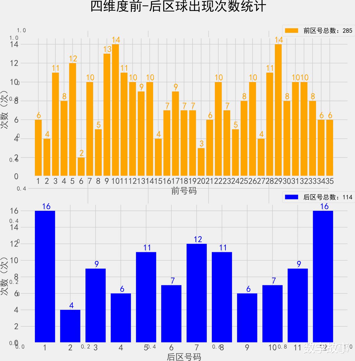 => 统计出现概率综合以上4个纬度的号码,共57期根据出现次数,分为热号,冷号,其他的为温号。统计样本数据: 285个前区号码 114个后区号码