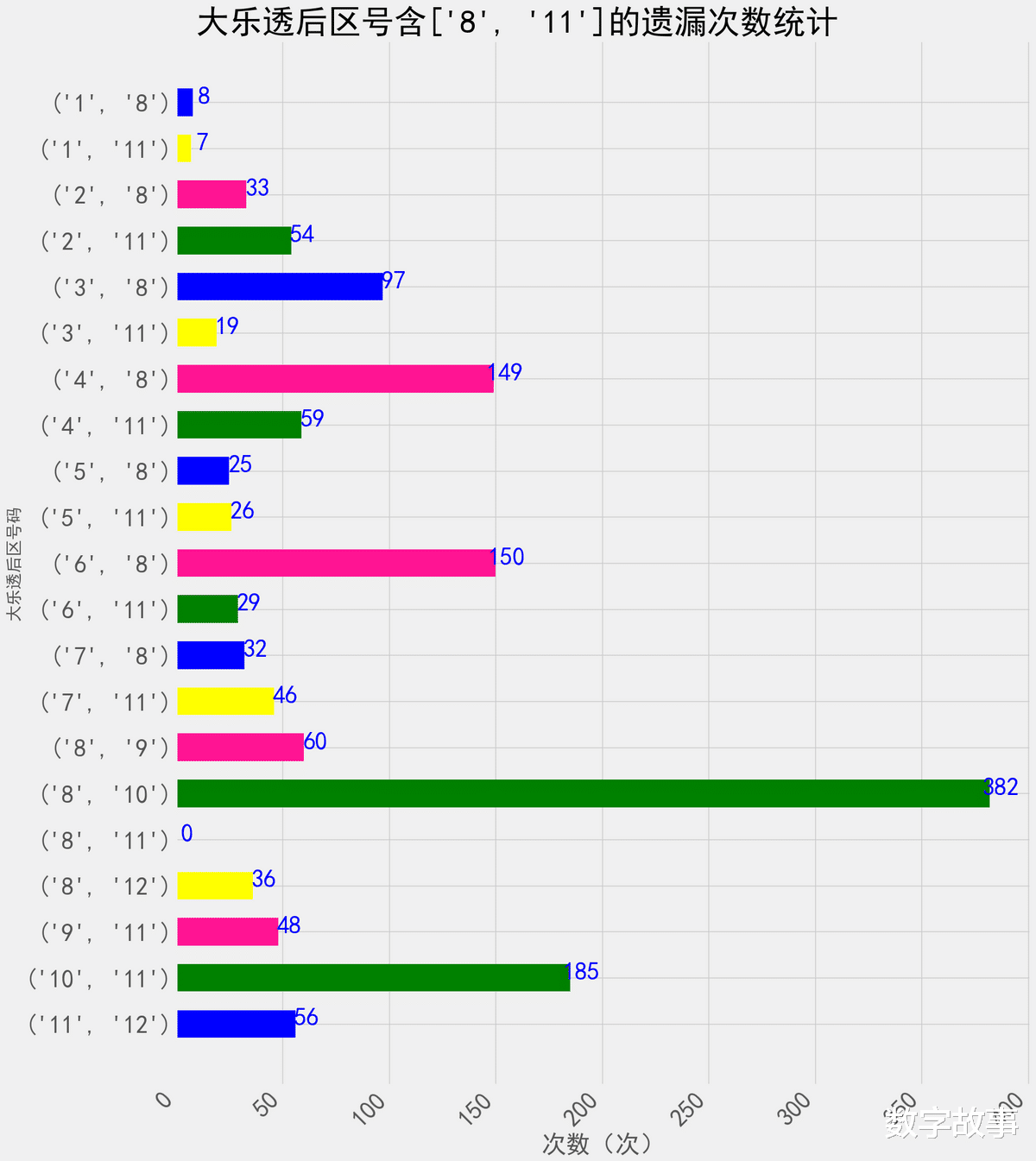 如图所示, 遗漏次数较多的双号组合如下:4-8: 149期6-8: 150期10-11: 185期8-10: 382期