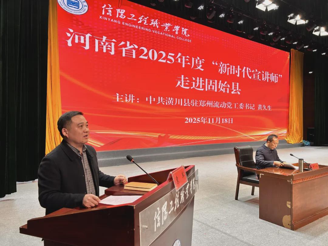 为扎实推进河南省2025年"新时代宣讲师"文明实践活动,11月18日,信阳工程职业学院特邀第四届全国道德模范、全国优秀共产党员黄久生同志来校,作"当好农民工的带头人,争做跟党走的排头兵"专题宣讲。学生工作处处长袁军主持,全校师生代表到会聆听。