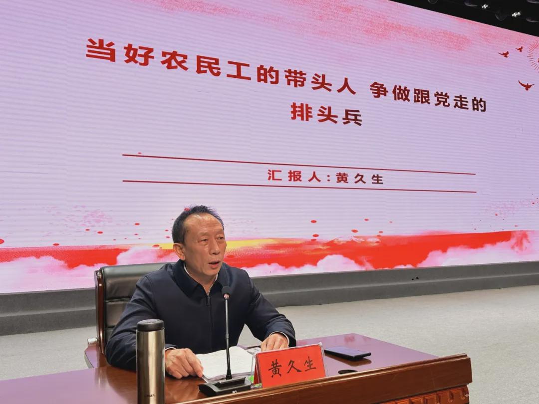 报告会上,黄久生同志用质朴的语言、生动的事例,深情讲述了自己从童年逆境奋起到成长为优秀共产党员的奋斗历程。6岁起便承担起照顾家庭的重担,踩着土坯做饭、上山拾柴凑学费,乡邻们的一碗饺子、一双布鞋让他始终铭记感恩;18岁赴郑州务工,从基层建筑工人成长为技术精湛的行家里手,带领团队两度荣获国家建筑最高奖——鲁班奖;29年如一日义务赡养700多位孤寡老人,捐建希望小学,资助600多名贫困学生完成学业,其中受助学子王道然、王浩瀚已考入清华大学;组织带领40多万人次农民工务工增收,帮助22000多建档立卡贫困户脱贫,每年为家乡带回劳务收入超8亿元,以实际行动诠释了"滴水之恩当涌泉相报"的传统美德。
