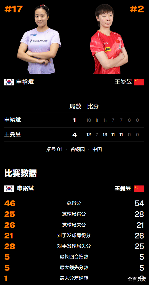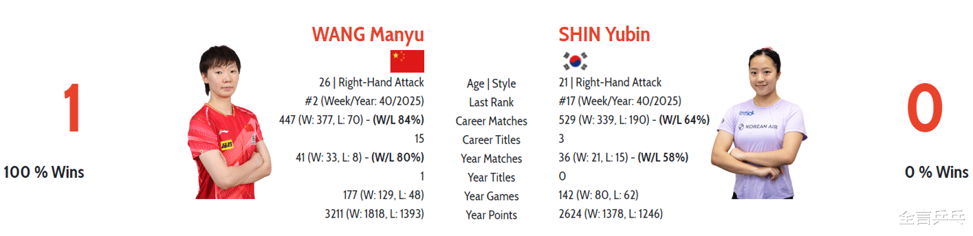 王曼昱是目前世界排名第2的国乒主力,申裕斌曾排名世界前十、但近期下滑到了第17位,不过本站比赛的表现非常突出,成功从女单3/4区脱颖而出,击败国乒主力蒯曼等人拿到外协会唯一的半决赛席位,同时也让中国队无缘包揽该项目4强。