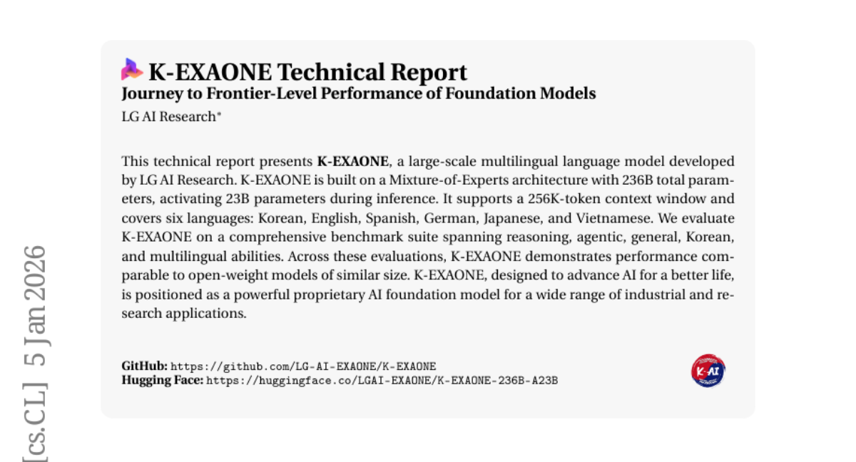 这项由LG AI Research团队开发的突破性研究发表于2025年1月,论文编号为arXiv:2601.01739v1,有兴趣深入了解的读者可以通过该编号查询完整论文。研究团队汇集了众多顶尖AI专家,包括核心贡献者崔恩比、崔基峰、洪锡熙等数十位研究人员,共同打造了这个被称为K-EXAONE的超大规模人工智能模型。