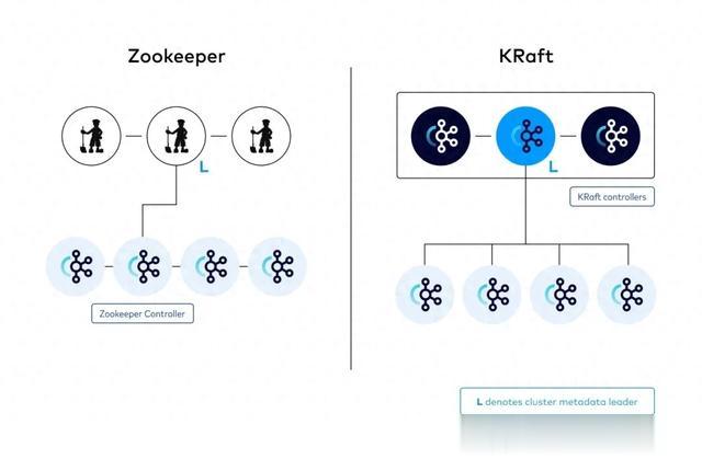 完全内置,自包含:KRaft 将所有协调服务嵌入 Kafka 自身,不再依赖外部系统,这样大大简化了部署和管理,因为管理员只需关注 Kafka 集群。高效的一致性协议:Raft 是一种简洁且易于理解的一致性算法,易于调试和实现。KRaft 利用 Raft 协议实现了强一致性的元数据管理,优化了复制机制。提高元数据操作的扩展性:新的架构允许更多的并发操作,并减少了因为扩展性问题导致的瓶颈,特别是在高负载场景中。降低延迟:在消除 ZooKeeper 作为中间层之后,Kafka 的延迟性能有望得到改善,特别是在涉及选主和元数据更新的场景中。完全自主:因为是自家产品,所以产品的架构设计,代码开发都可以自己说了算,未来架构走向完全控制在自己手上。KRaft的设计细节控制器(Controller)节点的去中心化:KRaft 模式中,控制器节点由一组 Kafka 服务进程代替,而不是一个独立的 ZooKeeper 集群。这些节点共同负责管理集群的元数据,通过 Raft 实现数据的一致性。日志复制和恢复机制:利用 Raft 的日志复制和状态机应用机制,KRaft 实现了对元数据变更的强一致性支持,这意味着所有控制器节点都能够就集群状态达成共识。动态集群管理:KRaft 允许动态地向集群中添加或移除节点,而无需手动去 ZooKeeper 中更新配置,这使得集群管理更为便捷。下面给出一张 Zookeeper 和 KRaft的对比图: