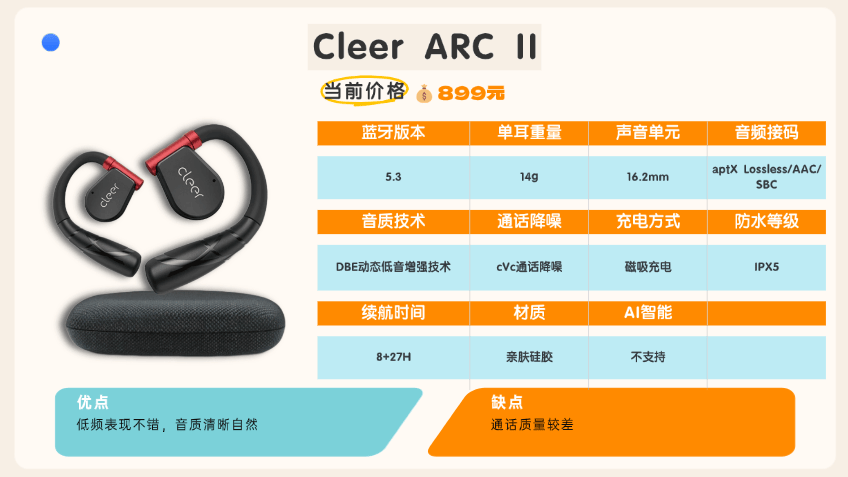 Cleer ARC II采用人体工学设计,通过三点支撑结构实现稳固贴合的佩戴体验。开放式结构确保用户在聆听音乐时持续感知环境声,提升户外使用安全性。搭载16.2mm动圈单元,配合DBE动态低音增强技术,在开放式结构中实现相对饱满的低频响应。人声表现清晰自然,中频密度适中,高频延展柔和顺滑。其声学结构在控制漏音方面效果良好,不过受物理结构限制,极低频下潜和冲击力仍显不足,更适合追求均衡听感的用户。