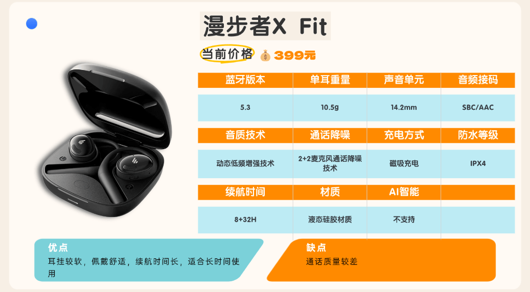 漫步者x fit采用分体式耳挂结构,佩戴稳固不易滑落,机身轻盈,长时间使用负担感较低。音质上搭载14.2mm动圈单元,支持动态低频增强技术,开启后可明显提升低频量感与音乐氛围,但相应会削弱部分中高频细节,并增加功耗。整体听感偏向下盘,适合喜欢节奏感和氛围营造的用户。