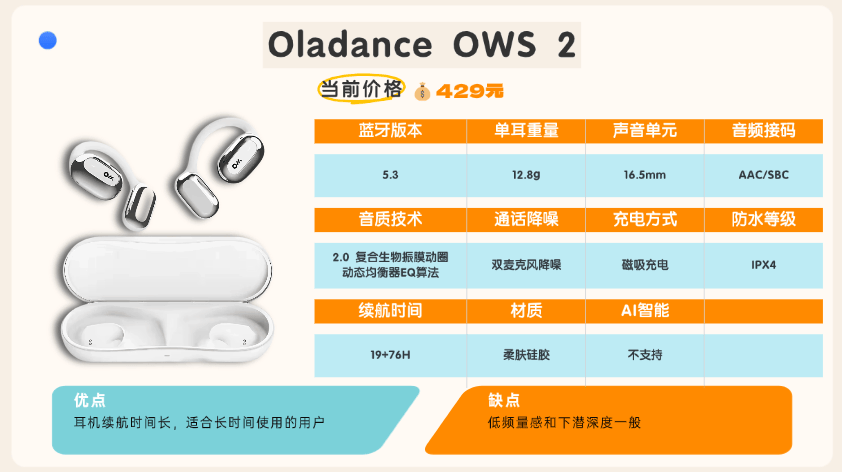 Oladance OWS 2采用全弹力耳挂设计,接触皮肤的柔肤硅胶材质有助于提升佩戴的贴合度与舒适性。耳机搭载16.5mm复合生物振膜动圈单元,配合动态均衡算法,其中频较为饱满,人声清晰,高频细节也有不错的表现。由于采用开放式设计,其在低频表现上相对温和,声音整体均衡,适合日常聆听流行、人声等内容。