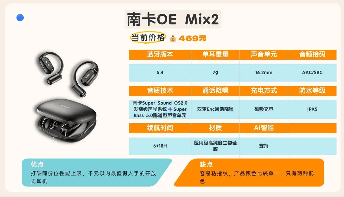 针对市面大多数开放式耳机漏音严重的问题,南卡OE Mix2采用了升级版DS 2.0指向性声学技术+创新U型声学通道结构,能够有效降低漏音情况,保护个人隐私。同时还搭载了蓝牙5.4芯片,对比以往的5.2、5.3版本,使用更加流畅,抗干扰能力更强。并且还拥有IPX5级防水能力、24小时全天续航以及AI智能功能,配置非常丰富,能够带来远超同价位竞品的高水准体验,作为百元性价比开放式耳机首选,肯定是最为稳妥的。