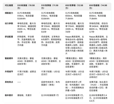 为了让大家看得更清楚,我把4个版本的核心配置、差价整理成了表格,从续航、动力、舒适配置、智能硬件这几个选车时最关心的维度做对比,每一项都标得明明白白: