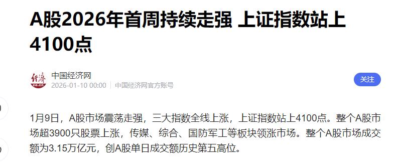 上证指数从2025年12月17日起走出十六连阳,时隔十年重返4100点,1月9日成交额突破3万亿元,创下A股历史第六次3万亿级成交纪录