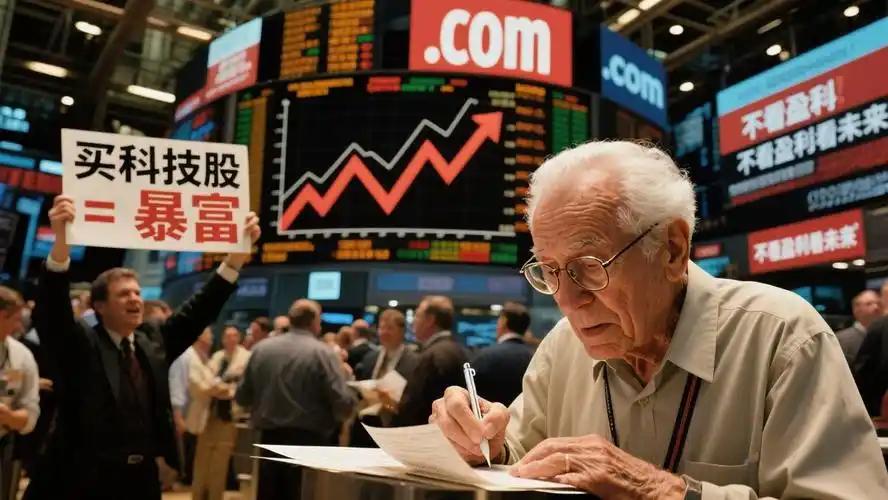 再看2000年美国互联网泡沫:上世纪90年代末,互联网概念兴起,只要公司沾“.”com”,即便无营收、无盈利,股价也疯狂上涨。