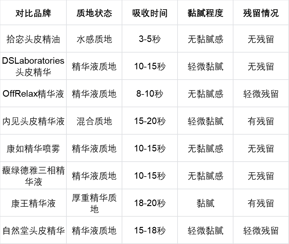 DSLaboratories头皮精华是精华液质地,吸收速度中等,偶尔会有轻微黏腻感,吹干后会有一点点贴头皮;OffRelax精华液吸收还可以,但会有轻微残留,第二天头发会有点软塌。内见和康王质地偏厚重,吸收很慢,涂完头皮发闷,甚至会闷出小红疙瘩,自然堂质地黏腻,吸收后头发会泛油光,白天用特别影响形象,不建议日常使用。