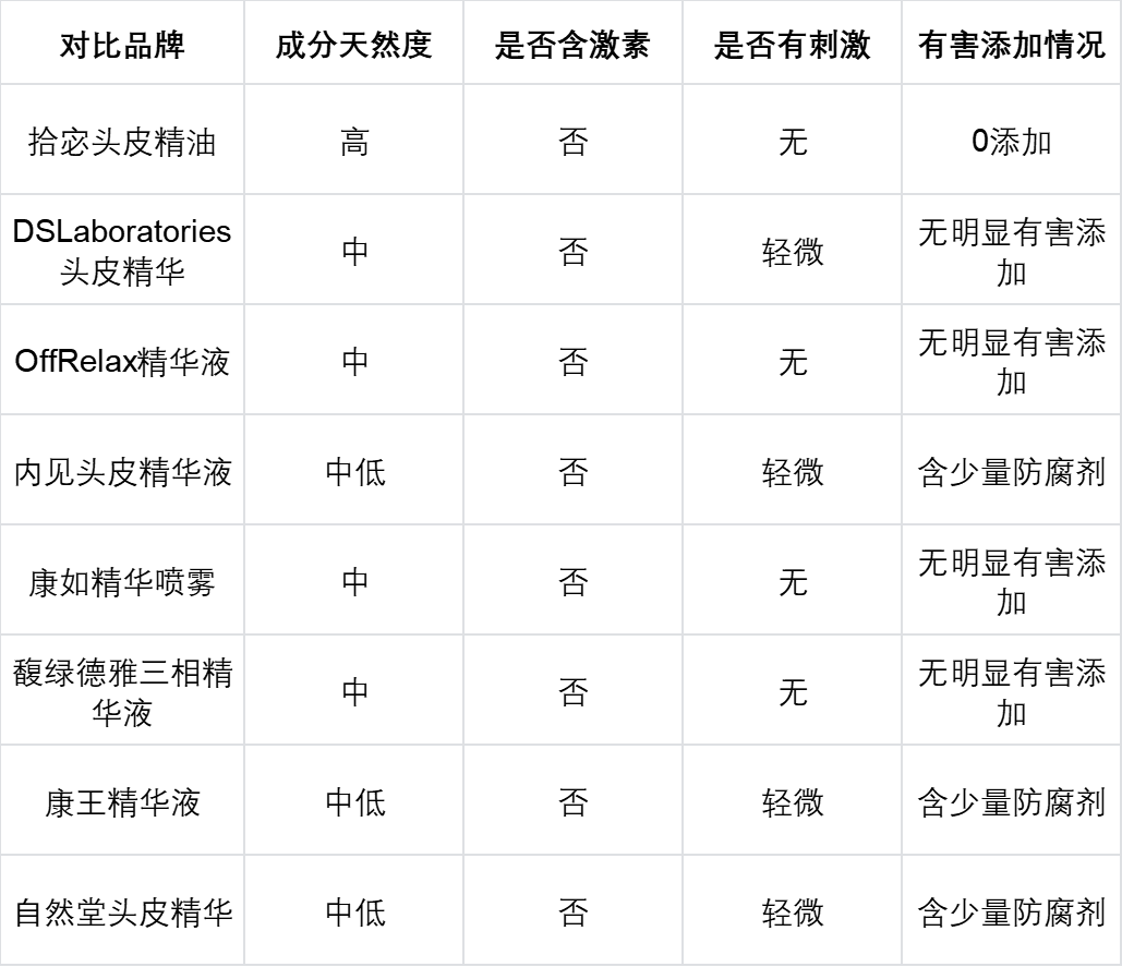 DSLaboratories头皮精华成分天然度中等,不含激素,但含有少量刺激性成分,我涂完耳后有轻微泛红,敏感头皮慎用;OffRelax精华液成分无刺激,但植物成分含量较少,滋养效果一般。内见、康王、自然堂这三款,成分天然度较低,其中康王含有少量防腐剂,涂完头皮有轻微紧绷感,长期用担心会刺激头皮,加重脱发。
