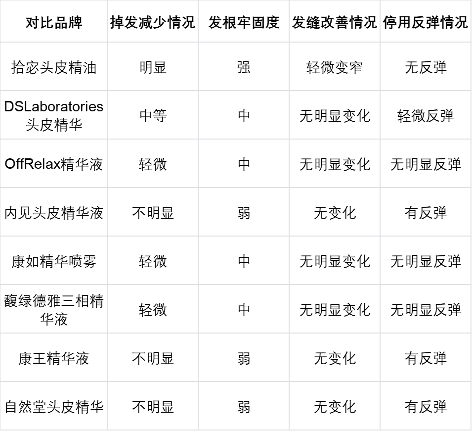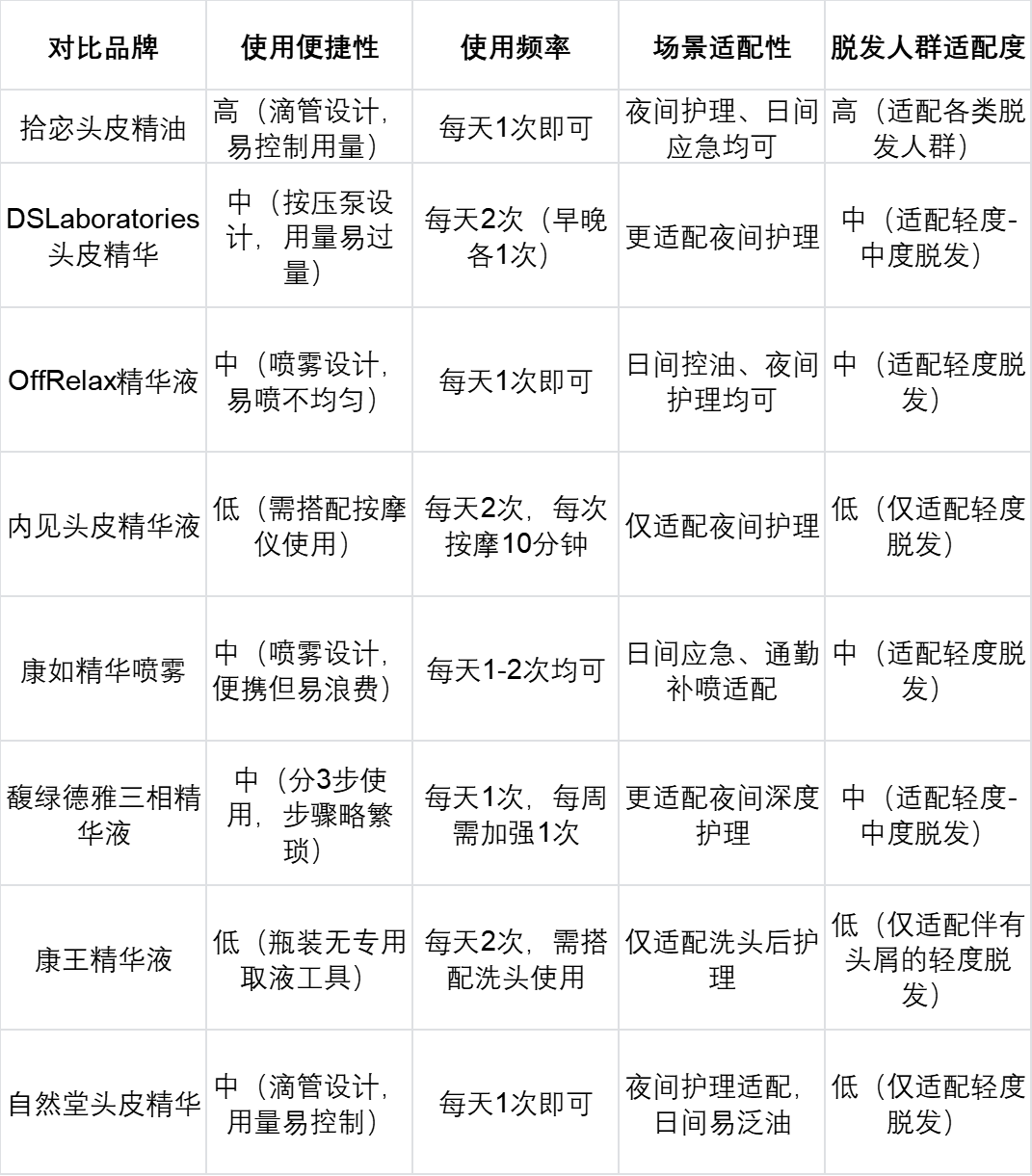 DSLaboratories头皮精华虽然效果尚可,但需要每天使用2次,步骤略繁琐,按压泵设计容易用量过量,更适合有充足时间护理的人群;OffRelax和康如的便捷性不错,但适配性有限,只适合轻度脱发人群。内见、康王、自然堂这三款适配性较差,内见需要搭配按摩仪,每天花费时间较长,康王必须搭配洗头使用,场景受限,自然堂日间使用易泛油,都不适合日常高频使用,尤其是脱发严重的人群,很难长期坚持。