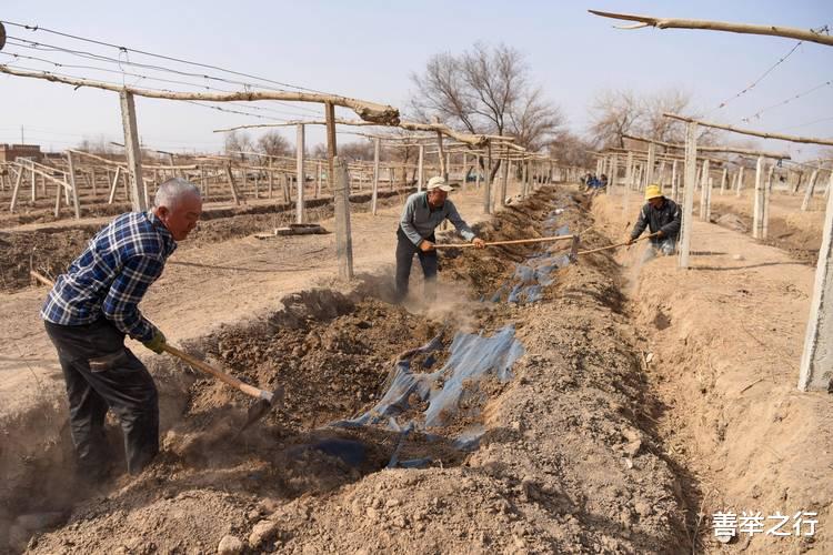 葡萄园埋树忙是冬季葡萄种植管理的重要环节,主要目的是通过埋土防寒保护葡萄藤蔓安全越冬。