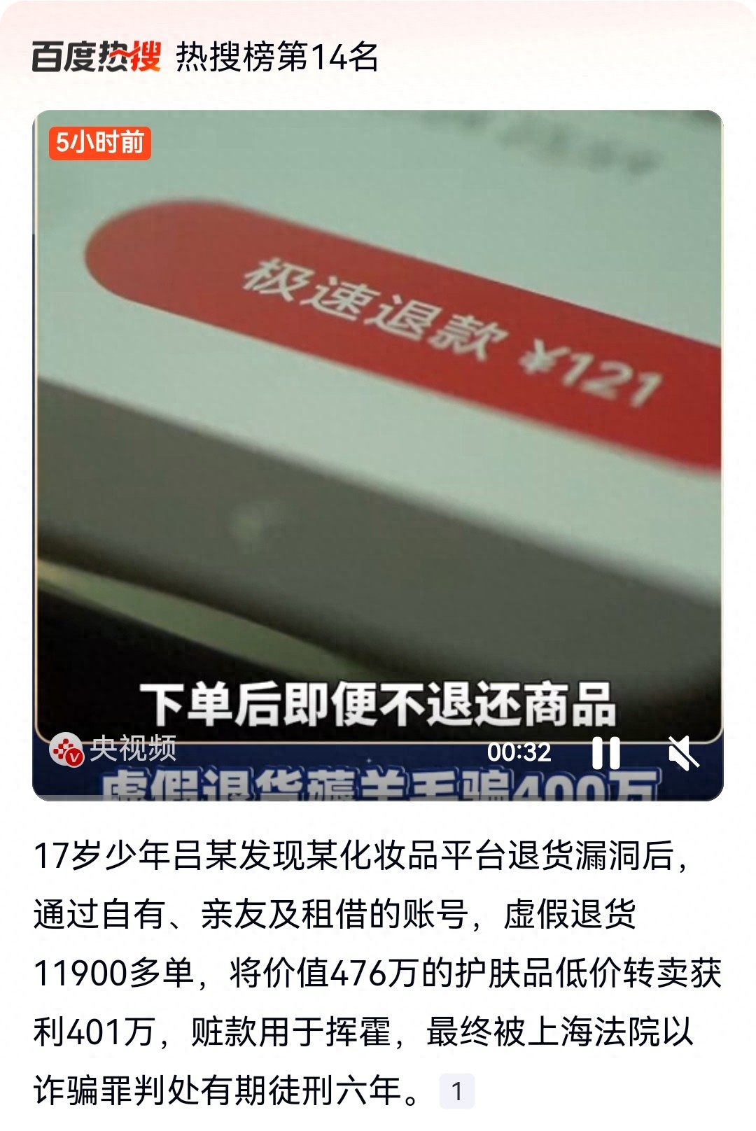 2024年3月,上海警方破获一起由17岁少年吕某策划的网络诈骗案。吕某发现某知名化妆品平台存在退货漏洞,利用自有、亲友及租借账号,虚假退货11900余单,将价值约476万元的护肤品低价转售获利约401万元。最终,少年因诈骗罪被法院判处有期徒刑六年。这一事件引发社会对电商平台安全漏洞及青少年网络犯罪的广泛关注。