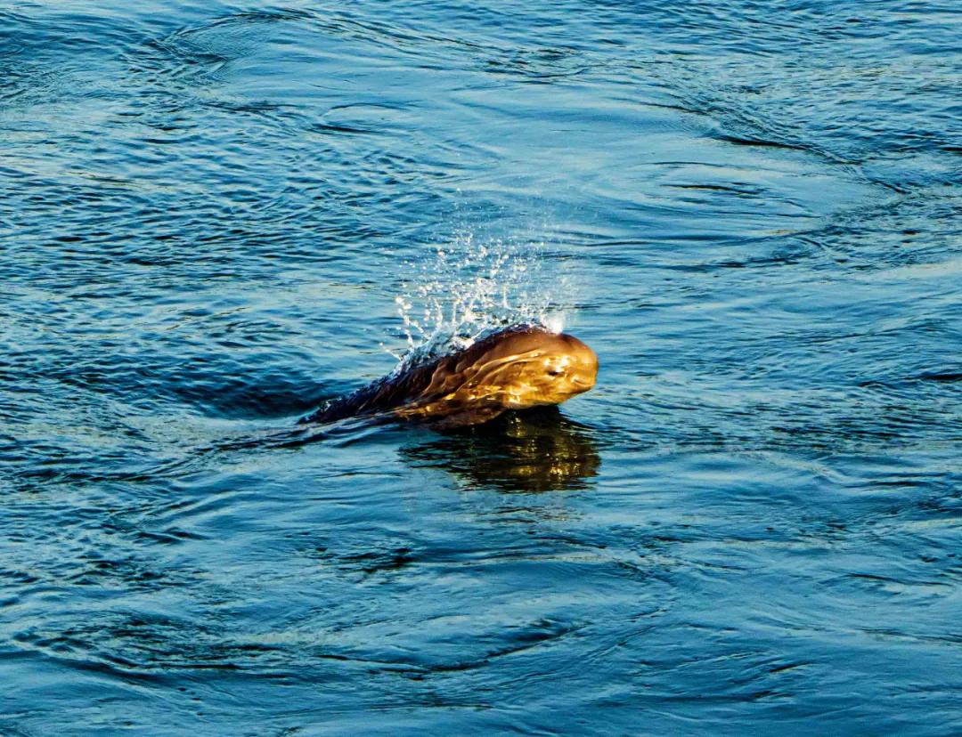 水面恢复平静几秒钟后,江豚冒出水面,摆动尾巴沉入水中。在它再次伸出头的同时,一条20厘米长的鱼从其嘴边划过。与鱼周旋几圈后,江豚抬头张嘴将鱼儿一口咬住,没入水中。