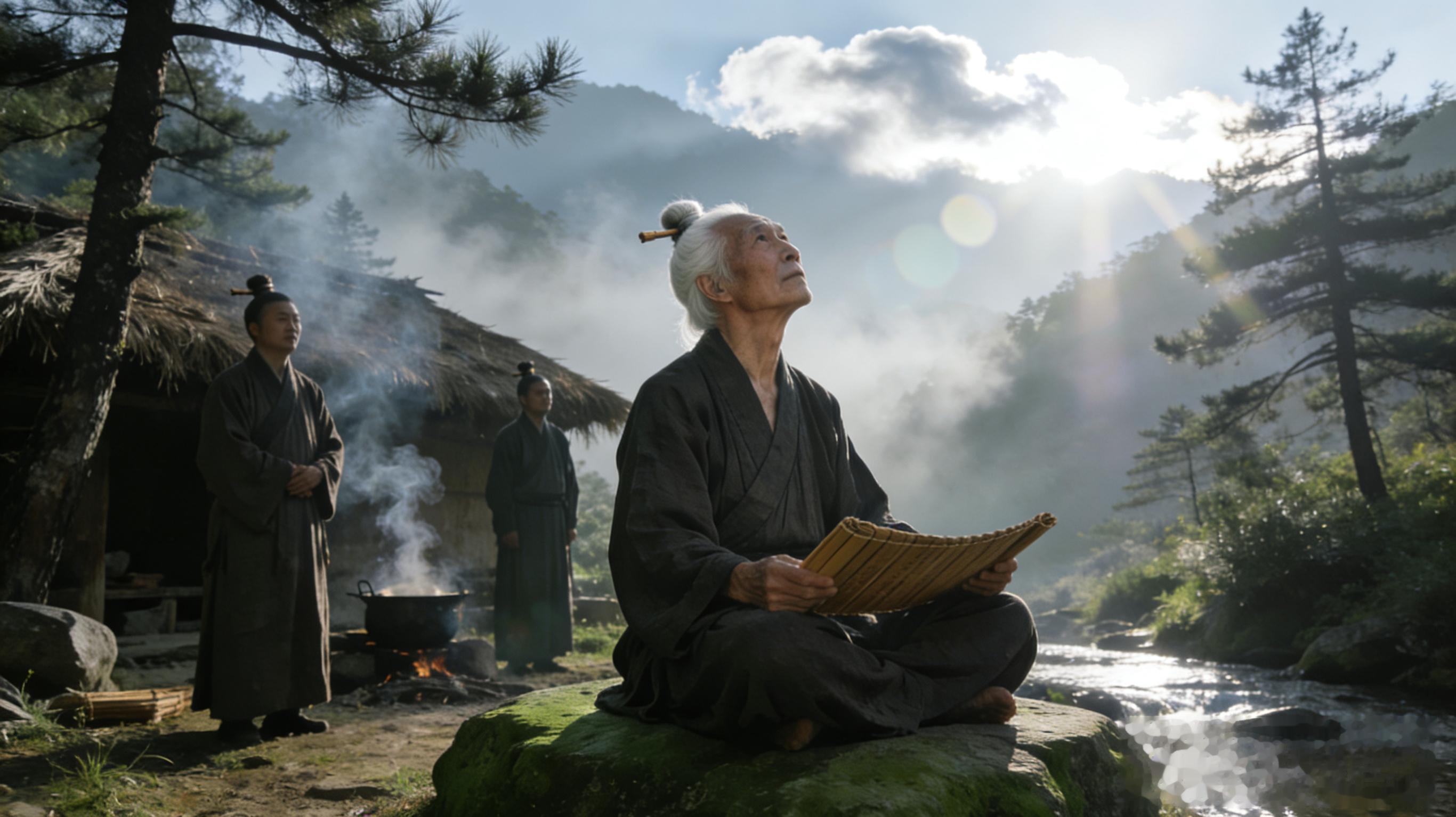 茅庐里,一位白发老者正坐在蒲团上,煮着粗陶壶里的水。