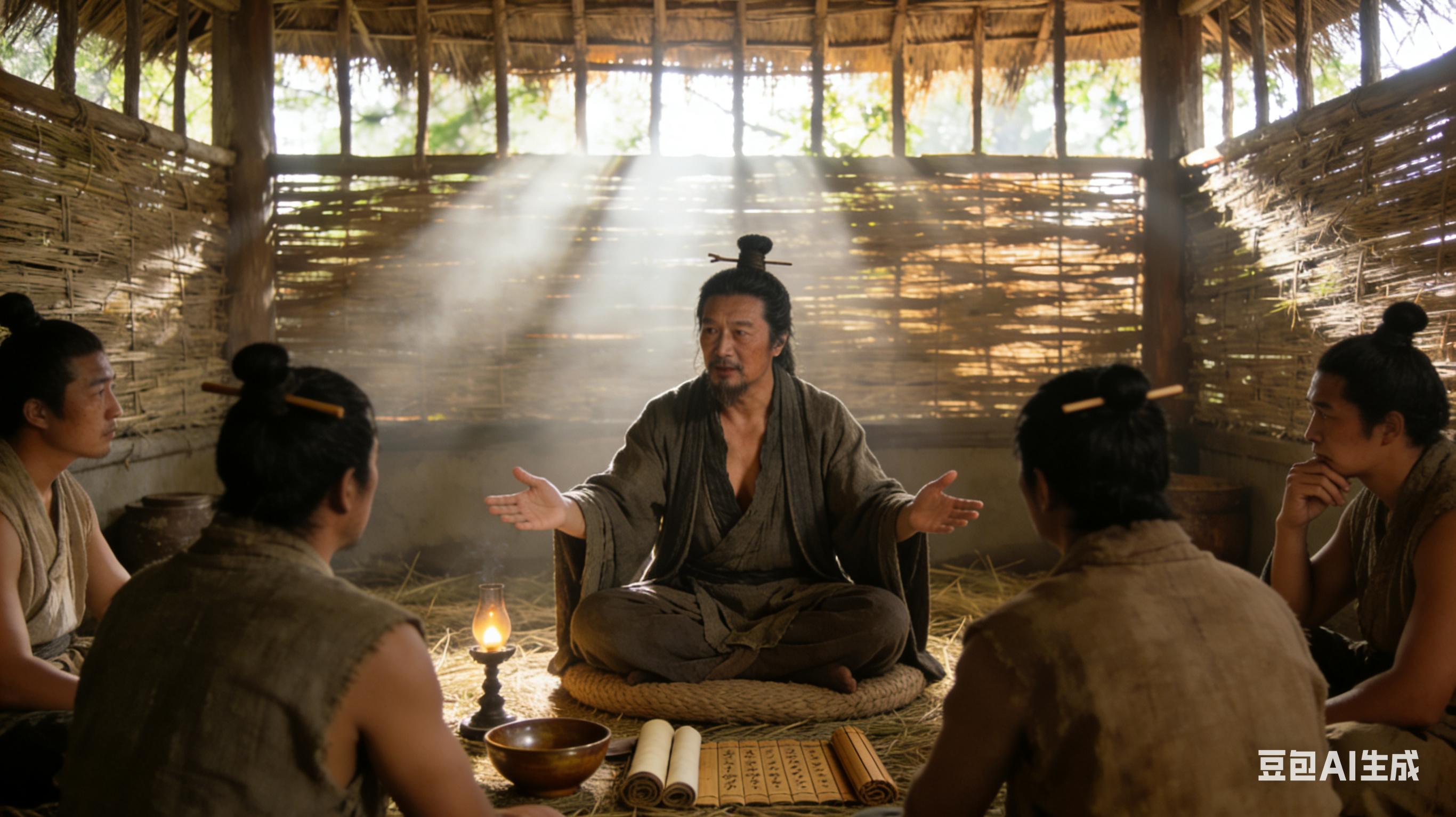 老子没有反驳,只是低头添了些柴火,火光映得他的白发微微发亮。