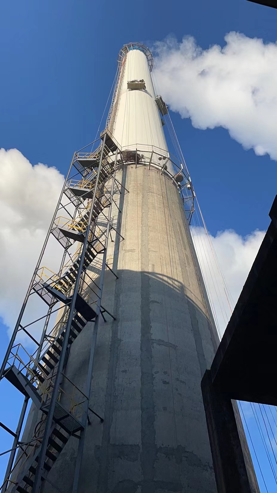 2.垂直度控制:使用激光铅垂仪从底部基准点向上投射激光束,在烟囱顶部设置接收靶,调整接收靶位置确保激光束与基准点重合;每安装一节爬梯,用全站仪复核垂直度,偏差控制在5mm以内,全高累计偏差不超过10mm,大风天气暂停测量作业。