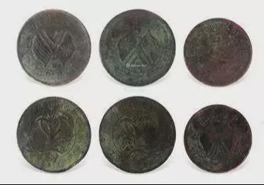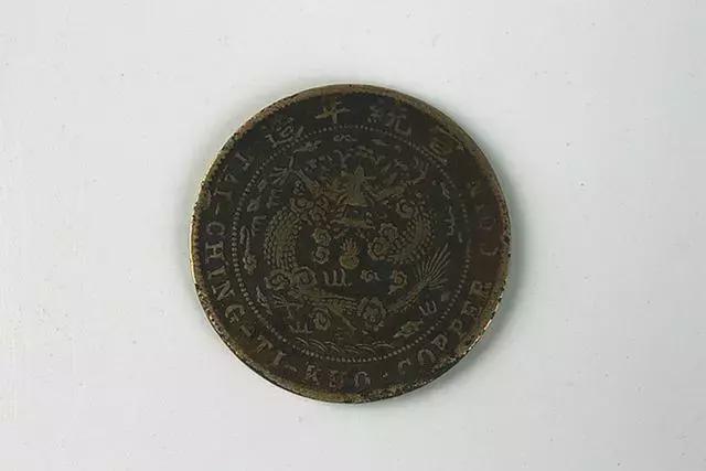 安徽省凤阳县中都城内一农民建房挖地基时,挖出一陶罐十余斤铜元,其中一枚为白铜样钱,该钱光边,直径2.9厘米,厚0.11厘米,重9克。面文纪值“十文”,外围嘉禾图案,上部铸“宣统三年”,下部“百枚换银币一圆”,两边各有小花一朵。背面,中圈内为“五尾蟠龙”,外为“大清铜元”四字,分布上、下、左、右。该钱设计新颖,制造精致,是钱币中的精品。清代末年,当方孔铜钱难以维持,行将退伍的时候,一种形态新颖的圆形无孔铜币跨进了钱币的行列。由于样式新颖,所以一出世颇受社会欢迎,后因铸造铜元有利可图,各省竞相鼓铸,使市面铜元大增。