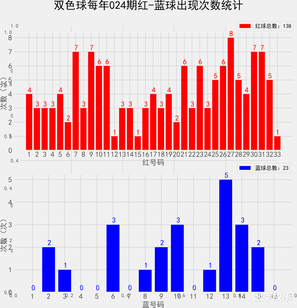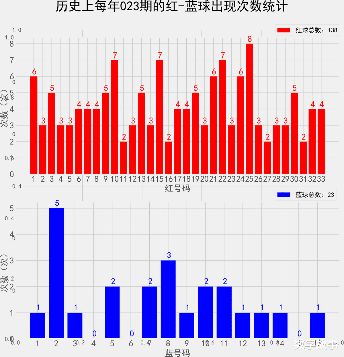 统计每年023期的样本数据:138个红球 23个蓝球