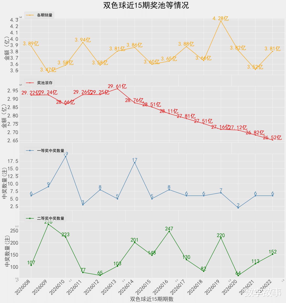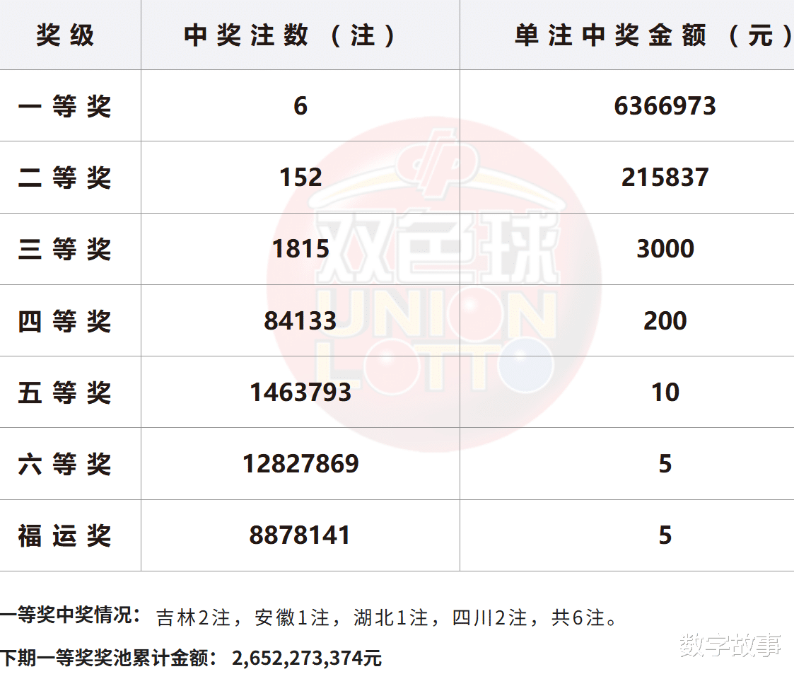 双色球26022期一等奖: 6注二等奖: 152注本期全国销售金额:380507698 元 奖池滚存:2652273374 元.近15期奖池滚存, 中奖情况等信息: