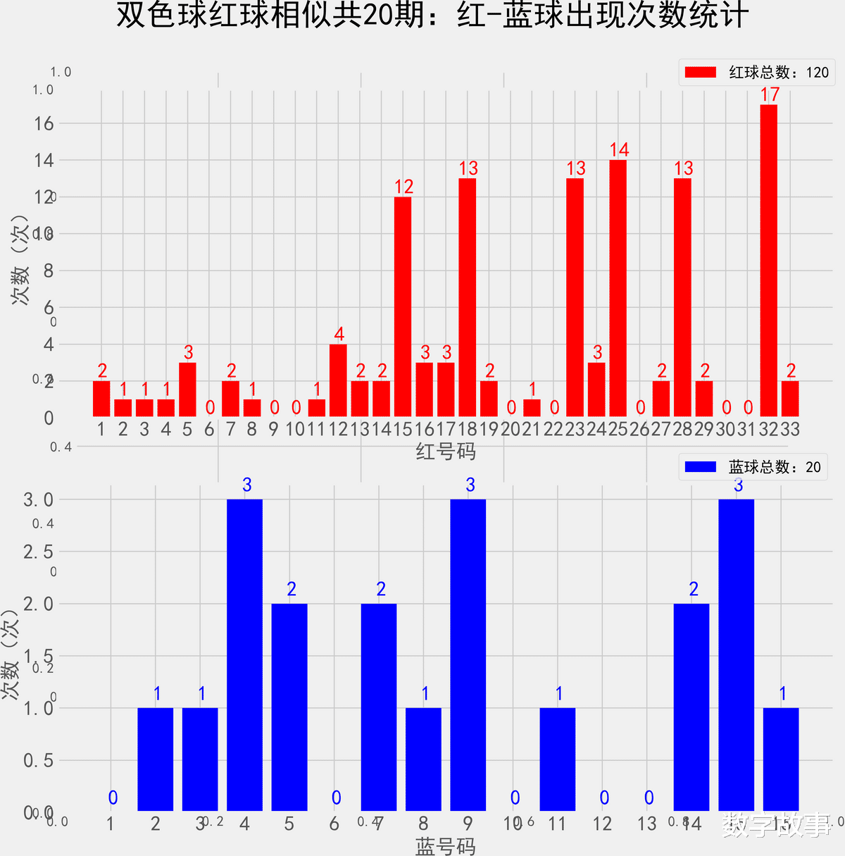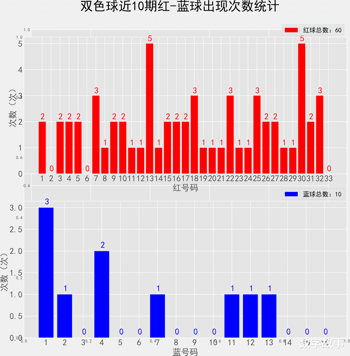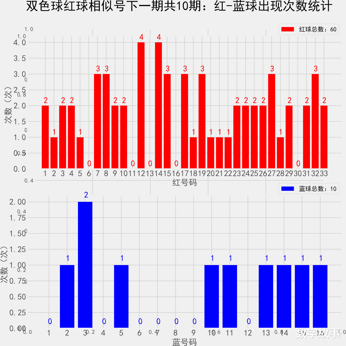 双色球近10期红蓝号统计情况统计样本数据: 60个红球 10个蓝球