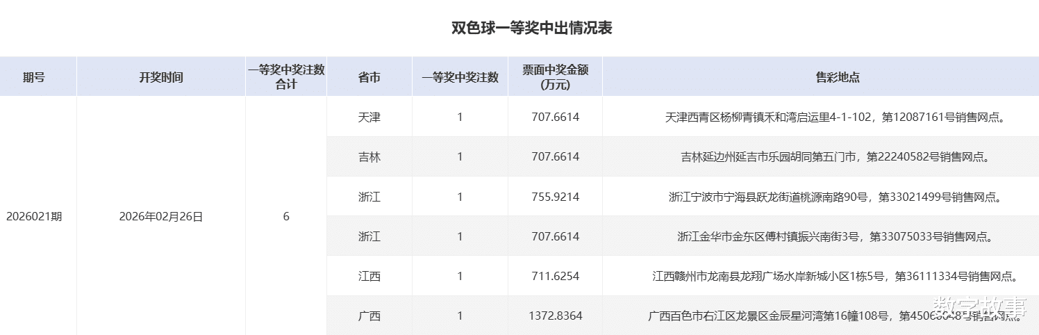 双色球26021期一等奖中奖详情