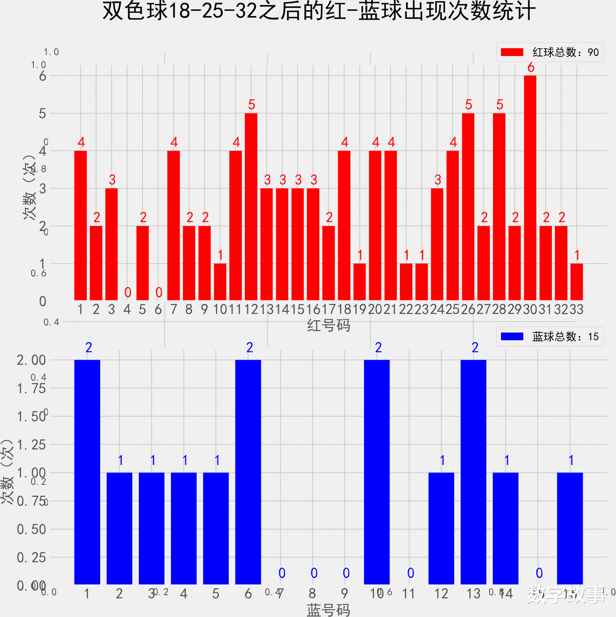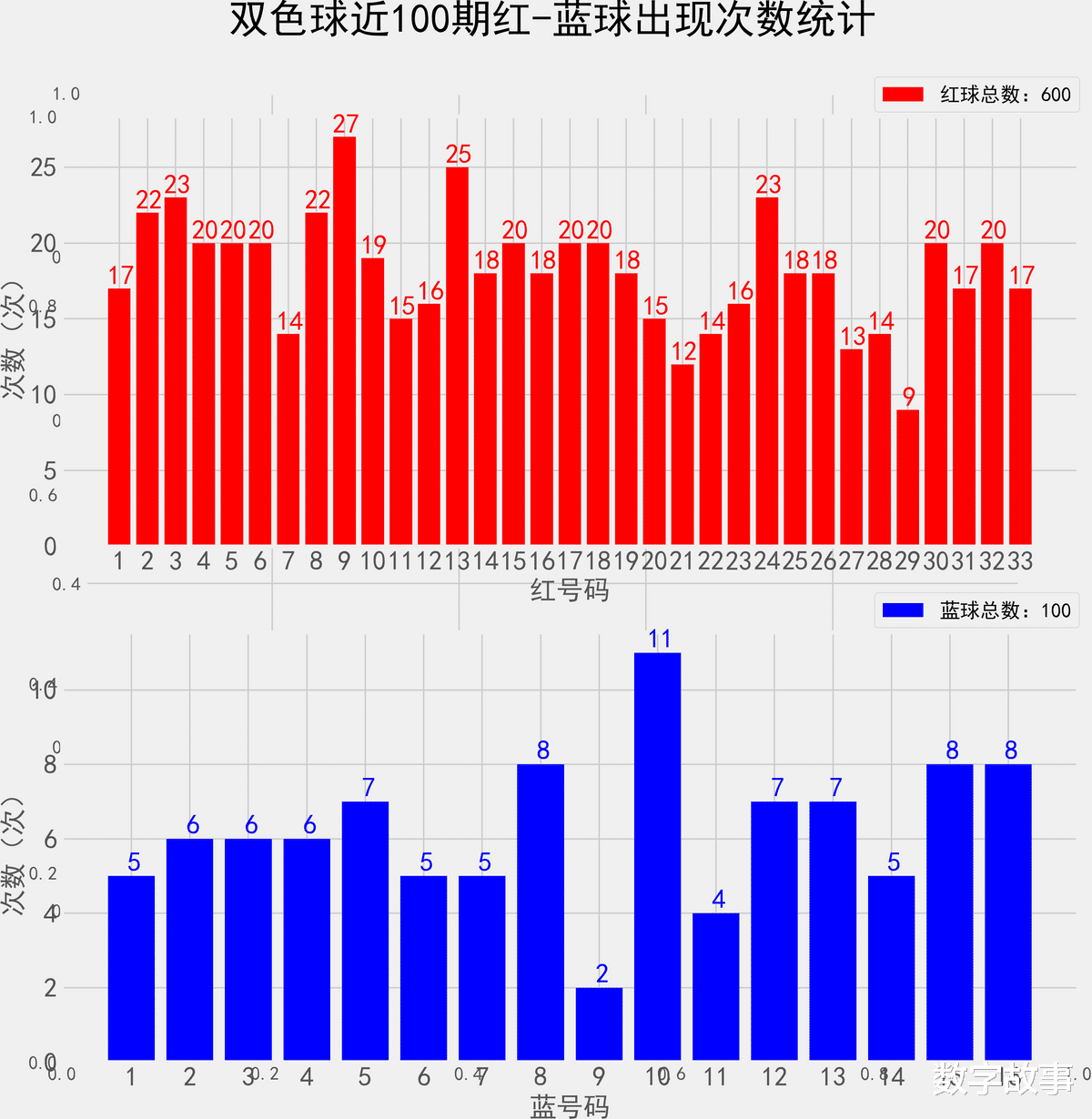 双色球近100期红蓝号统计情况统计样本数据: 600个红球 100个蓝球