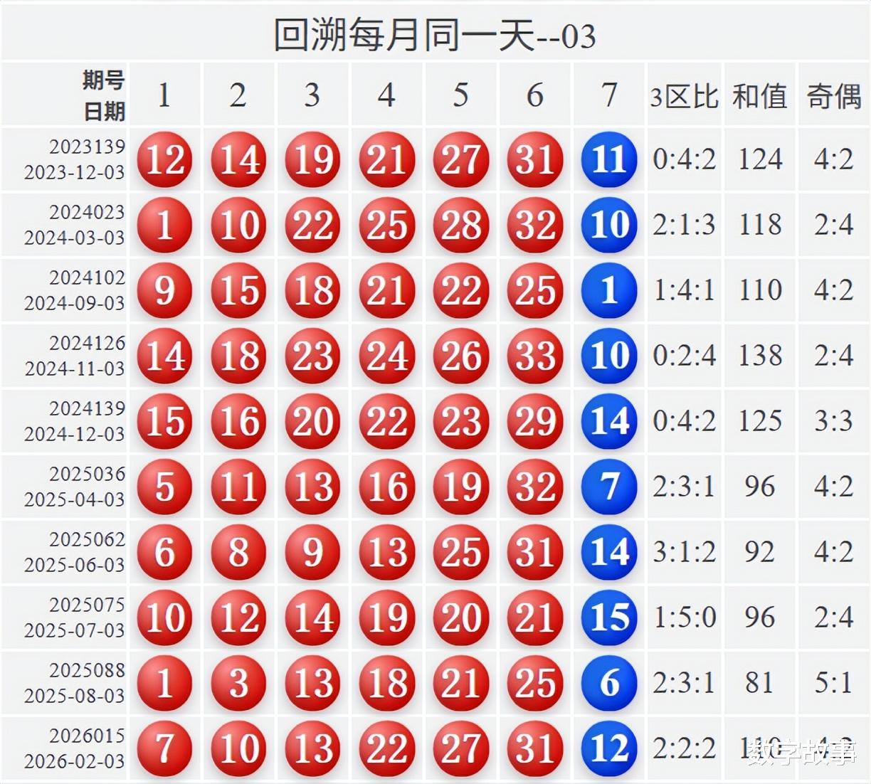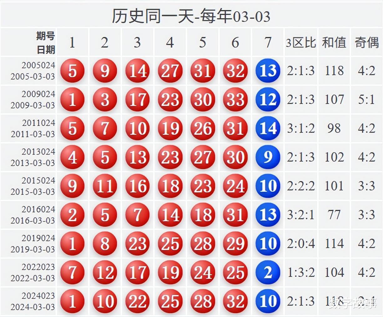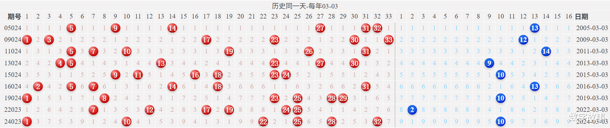 博弈心理,挑战概率: 看近期开奖号码,也可看历史数据统计!【双色球26023期多角度冷热号】双色球26023期四维走势图,红蓝号统计及冷热号1) 历史同一天: 03月03日 (共9期)
