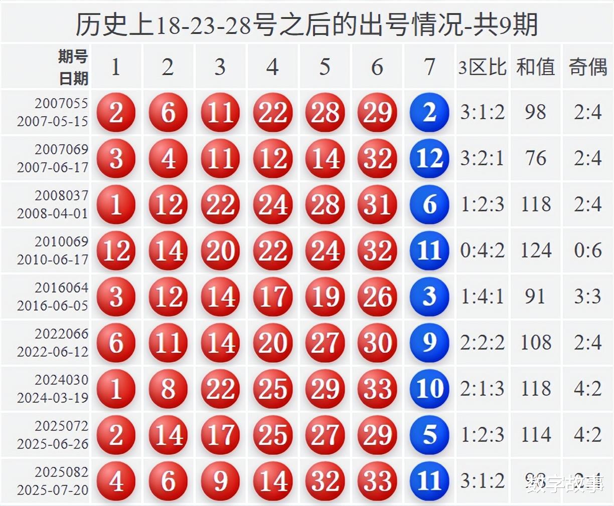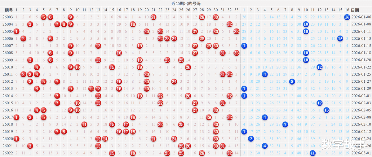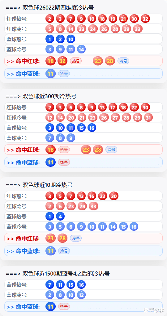 双色球2026022期红号在过去是否出现过?双色球2026022期红号: 15-18-23-25-28-32经查,历史上没有出现过与这一期6个红球或者5个红球号码一样的。与这一期4个红号一样的有19期,如下: